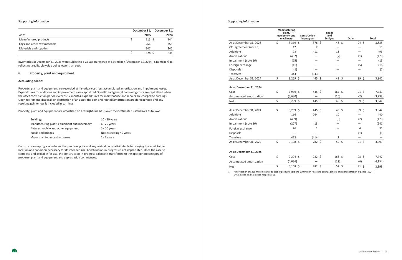 Supporting information December 31, December 31, As at 2025 2024 Manufactured products $ 315 $ 344 Logs and other raw materials 266 255 Materials and supplies 247 245 $ 828 $ 844 Inventories at December 31, 2025 were subject to a valuation reserve of $64 million (December 31, 2024 - $18 million) to reflect net realizable value being lower than cost. 6. Property, plant and equipment Accounting policies Property, plant and equipment are recorded at historical cost, less accumulated amortization and impairment losses. Expenditures for additions and improvements are capitalized. Specific and general borrowing costs are capitalized when the asset construction period exceeds 12 months. Expenditures for maintenance and repairs are charged to earnings. Upon retirement, disposal, or destruction of an asset, the cost and related amortization are derecognized and any resulting gain or loss is included in earnings. Property, plant and equipment are amortized on a straight-line basis over their estimated useful lives as follows: Buildings 10 - 30 years Manufacturing plant, equipment and machinery 6 - 25 years Fixtures, mobile and other equipment 3 - 10 years Roads and bridges Not exceeding 40 years Major maintenance shutdowns 1 - 2 years Construction-in-progress includes the purchase price and any costs directly attributable to bringing the asset to the location and condition necessary for its intended use. Construction-in-progress is not depreciated. Once the asset is complete and available for use, the construction-in-progress balance is transferred to the appropriate category of property, plant and equipment and depreciation commences. -14- Supporting Information Manufacturing plant, equipment and machinery Construction- in-progress Roads and bridges Other Total As at December 31, 2023 $ 3,319 $ 376 $ 46 $ 94 $ 3,835 CPL agreement (note 3) 12 2 — — 15 Additions 73 411 11 — 495 Amortization1 (462) — (7) (1) (470) Impairment (note 16) (15) — — — (15) Foreign exchange (11) — — (5) (16) Disposals (2) — — — (2) Transfers 343 (343) — — — As at December 31, 2024 $ 3,259 $ 445 $ 49 $ 89 $ 3,842 As at December 31, 2024 Cost $ 6,939 $ 445 $ 165 $ 91 $ 7,641 Accumulated amortization (3,680) — (116) (2) (3,798) Net $ 3,259 $ 445 $ 49 $ 89 $ 3,842 As at December 31, 2024 $ 3,259 $ 445 $ 49 $ 89 $ 3,842 Additions 166 264 10 — 440 Amortization1 (469) — (8) (2) (478) Impairment (note 16) (227) (13) — — (241) Foreign exchange 26 1 — 4 31 Disposals — — — (1) (1) Transfers 413 (414) 1 — — As at December 31, 2025 $ 3,168 $ 282 $ 52 $ 91 $ 3,593 As at December 31, 2025 Cost $ 7,204 $ 282 $ 163 $ 98 $ 7,747 Accumulated amortization (4,036) — (112) (6) (4,154) Net $ 3,168 $ 282 $ 52 $ 91 $ 3,593 1. Amortization of $468 million relates to cost of products sold and $10 million relates to selling, general and administration expense (2024 - $462 million and $8 million respectively). -15- 2025 Annual Report | 105