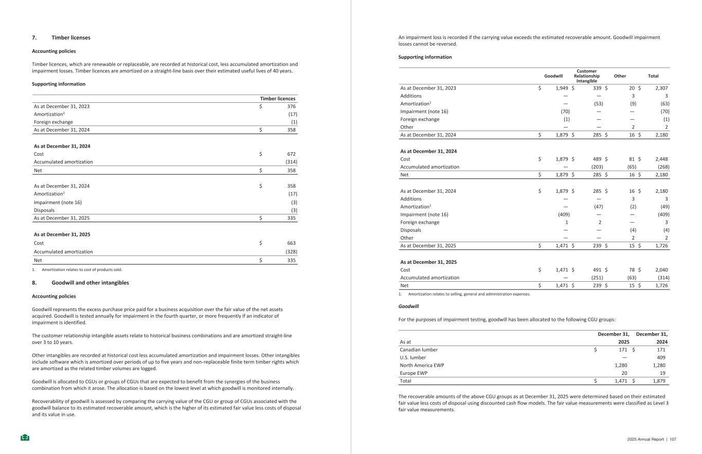 7. Timber licenses Accounting policies Timber licences, which are renewable or replaceable, are recorded at historical cost, less accumulated amortization and impairment losses. Timber licences are amortized on a straight-line basis over their estimated useful lives of 40 years. Supporting information Timber licences As at December 31, 2023 $ 376 Amortization1 (17) Foreign exchange (1) As at December 31, 2024 $ 358 As at December 31, 2024 Cost $ 672 Accumulated amortization (314) Net $ 358 As at December 31, 2024 $ 358 Amortization1 (17) Impairment (note 16) (3) Disposals (3) As at December 31, 2025 $ 335 As at December 31, 2025 Cost $ 663 Accumulated amortization (328) Net $ 335 1. Amortization relates to cost of products sold. 8. Goodwill and other intangibles Accounting policies Goodwill represents the excess purchase price paid for a business acquisition over the fair value of the net assets acquired. Goodwill is tested annually for impairment in the fourth quarter, or more frequently if an indicator of impairment is identified. The customer relationship intangible assets relate to historical business combinations and are amortized straight-line over 3 to 10 years. Other intangibles are recorded at historical cost less accumulated amortization and impairment losses. Other intangibles include software which is amortized over periods of up to five years and non-replaceable finite term timber rights which are amortized as the related timber volumes are logged. Goodwill is allocated to CGUs or groups of CGUs that are expected to benefit from the synergies of the business combination from which it arose. The allocation is based on the lowest level at which goodwill is monitored internally. Recoverability of goodwill is assessed by comparing the carrying value of the CGU or group of CGUs associated with the goodwill balance to its estimated recoverable amount, which is the higher of its estimated fair value less costs of disposal and its value in use. -16- An impairment loss is recorded if the carrying value exceeds the estimated recoverable amount. Goodwill impairment losses cannot be reversed. Supporting information Goodwill Customer Relationship Intangible Other Total As at December 31, 2023 $ 1,949 $ 339 $ 20 $ 2,307 Additions — — 3 3 Amortization1 — (53) (9) (63) Impairment (note 16) (70) — — (70) Foreign exchange (1) — — (1) Other — — 2 2 As at December 31, 2024 $ 1,879 $ 285 $ 16 $ 2,180 As at December 31, 2024 Cost $ 1,879 $ 489 $ 81 $ 2,448 Accumulated amortization — (203) (65) (268) Net $ 1,879 $ 285 $ 16 $ 2,180 As at December 31, 2024 $ 1,879 $ 285 $ 16 $ 2,180 Additions — — 3 3 Amortization1 — (47) (2) (49) Impairment (note 16) (409) — — (409) Foreign exchange 1 2 — 3 Disposals — — (4) (4) Other — — 2 2 As at December 31, 2025 $ 1,471 $ 239 $ 15 $ 1,726 As at December 31, 2025 Cost $ 1,471 $ 491 $ 78 $ 2,040 Accumulated amortization — (251) (63) (314) Net $ 1,471 $ 239 $ 15 $ 1,726 1. Amortization relates to selling, general and administration expenses. Goodwill For the purposes of impairment testing, goodwill has been allocated to the following CGU groups: December 31, December 31, As at 2025 2024 Canadian lumber $ 171 $ 171 U.S. lumber — 409 North America EWP 1,280 1,280 Europe EWP 20 19 Total $ 1,471 $ 1,879 The recoverable amounts of the above CGU groups as at December 31, 2025 were determined based on their estimated fair value less costs of disposal using discounted cash flow models. The fair value measurements were classified as Level 3 fair value measurements. -17- 2025 Annual Report | 107