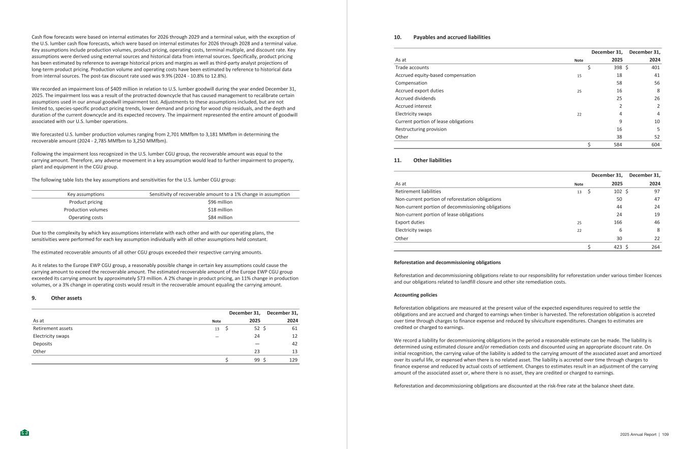 Cash flow forecasts were based on internal estimates for 2026 through 2029 and a terminal value, with the exception of the U.S. lumber cash flow forecasts, which were based on internal estimates for 2026 through 2028 and a terminal value. Key assumptions include production volumes, product pricing, operating costs, terminal multiple, and discount rate. Key assumptions were derived using external sources and historical data from internal sources. Specifically, product pricing has been estimated by reference to average historical prices and margins as well as third-party analyst projections of long-term product pricing. Production volume and operating costs have been estimated by reference to historical data from internal sources. The post-tax discount rate used was 9.9% (2024 - 10.8% to 12.8%). We recorded an impairment loss of $409 million in relation to U.S. lumber goodwill during the year ended December 31, 2025. The impairment loss was a result of the protracted downcycle that has caused management to recalibrate certain assumptions used in our annual goodwill impairment test. Adjustments to these assumptions included, but are not limited to, species-specific product pricing trends, lower demand and pricing for wood chip residuals, and the depth and duration of the current downcycle and its expected recovery. The impairment represented the entire amount of goodwill associated with our U.S. lumber operations. We forecasted U.S. lumber production volumes ranging from 2,701 MMfbm to 3,181 MMfbm in determining the recoverable amount (2024 - 2,785 MMfbm to 3,250 MMfbm). Following the impairment loss recognized in the U.S. lumber CGU group, the recoverable amount was equal to the carrying amount. Therefore, any adverse movement in a key assumption would lead to further impairment to property, plant and equipment in the CGU group. The following table lists the key assumptions and sensitivities for the U.S. lumber CGU group: Key assumptions Sensitivity of recoverable amount to a 1% change in assumption Product pricing $96 million Production volumes $18 million Operating costs $84 million Due to the complexity by which key assumptions interrelate with each other and with our operating plans, the sensitivities were performed for each key assumption individually with all other assumptions held constant. The estimated recoverable amounts of all other CGU groups exceeded their respective carrying amounts. As it relates to the Europe EWP CGU group, a reasonably possible change in certain key assumptions could cause the carrying amount to exceed the recoverable amount. The estimated recoverable amount of the Europe EWP CGU group exceeded its carrying amount by approximately $73 million. A 2% change in product pricing, an 11% change in production volumes, or a 3% change in operating costs would result in the recoverable amount equaling the carrying amount. 9. Other assets December 31, December 31, As at Note 2025 2024 Retirement assets 13 $ 52 $ 61 Electricity swaps — 24 12 Deposits — 42 Other 23 13 $ 99 $ 129 -18- 10. Payables and accrued liabilities December 31, December 31, As at Note 2025 2024 Trade accounts $ 398 $ 401 Accrued equity-based compensation 15 18 41 Compensation 58 56 Accrued export duties 25 16 8 Accrued dividends 25 26 Accrued interest 2 2 Electricity swaps 22 4 4 Current portion of lease obligations 9 10 Restructuring provision 16 5 Other 38 52 $ 584 604 11. Other liabilities December 31, December 31, As at Note 2025 2024 Retirement liabilities 13 $ 102 $ 97 Non-current portion of reforestation obligations 50 47 Non-current portion of decommissioning obligations 44 24 Non-current portion of lease obligations 24 19 Export duties 25 166 46 Electricity swaps 22 6 8 Other 30 22 $ 423 $ 264 Reforestation and decommissioning obligations Reforestation and decommissioning obligations relate to our responsibility for reforestation under various timber licences and our obligations related to landfill closure and other site remediation costs. Accounting policies Reforestation obligations are measured at the present value of the expected expenditures required to settle the obligations and are accrued and charged to earnings when timber is harvested. The reforestation obligation is accreted over time through charges to finance expense and reduced by silviculture expenditures. Changes to estimates are credited or charged to earnings. We record a liability for decommissioning obligations in the period a reasonable estimate can be made. The liability is determined using estimated closure and/or remediation costs and discounted using an appropriate discount rate. On initial recognition, the carrying value of the liability is added to the carrying amount of the associated asset and amortized over its useful life, or expensed when there is no related asset. The liability is accreted over time through charges to finance expense and reduced by actual costs of settlement. Changes to estimates result in an adjustment of the carrying amount of the associated asset or, where there is no asset, they are credited or charged to earnings. Reforestation and decommissioning obligations are discounted at the risk-free rate at the balance sheet date. -19- 2025 Annual Report | 109