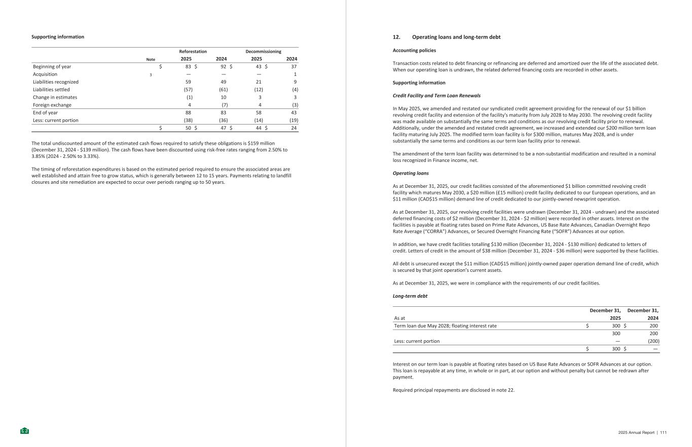 Supporting information Reforestation Decommissioning Note 2025 2024 2025 2024 Beginning of year $ 83 $ 92 $ 43 $ 37 Acquisition 3 — — — 1 Liabilities recognized 59 49 21 9 Liabilities settled (57) (61) (12) (4) Change in estimates (1) 10 3 3 Foreign exchange 4 (7) 4 (3) End of year 88 83 58 43 Less: current portion (38) (36) (14) (19) $ 50 $ 47 $ 44 $ 24 The total undiscounted amount of the estimated cash flows required to satisfy these obligations is $159 million (December 31, 2024 - $139 million). The cash flows have been discounted using risk-free rates ranging from 2.50% to 3.85% (2024 - 2.50% to 3.33%). The timing of reforestation expenditures is based on the estimated period required to ensure the associated areas are well established and attain free to grow status, which is generally between 12 to 15 years. Payments relating to landfill closures and site remediation are expected to occur over periods ranging up to 50 years. -20- 12. Operating loans and long-term debt Accounting policies Transaction costs related to debt financing or refinancing are deferred and amortized over the life of the associated debt. When our operating loan is undrawn, the related deferred financing costs are recorded in other assets. Supporting information Credit Facility and Term Loan Renewals In May 2025, we amended and restated our syndicated credit agreement providing for the renewal of our $1 billion revolving credit facility and extension of the facility's maturity from July 2028 to May 2030. The revolving credit facility was made available on substantially the same terms and conditions as our revolving credit facility prior to renewal. Additionally, under the amended and restated credit agreement, we increased and extended our $200 million term loan facility maturing July 2025. The modified term loan facility is for $300 million, matures May 2028, and is under substantially the same terms and conditions as our term loan facility prior to renewal. The amendment of the term loan facility was determined to be a non-substantial modification and resulted in a nominal loss recognized in Finance income, net. Operating loans As at December 31, 2025, our credit facilities consisted of the aforementioned $1 billion committed revolving credit facility which matures May 2030, a $20 million (£15 million) credit facility dedicated to our European operations, and an $11 million (CAD$15 million) demand line of credit dedicated to our jointly-owned newsprint operation. As at December 31, 2025, our revolving credit facilities were undrawn (December 31, 2024 - undrawn) and the associated deferred financing costs of $2 million (December 31, 2024 - $2 million) were recorded in other assets. Interest on the facilities is payable at floating rates based on Prime Rate Advances, US Base Rate Advances, Canadian Overnight Repo Rate Average (“CORRA”) Advances, or Secured Overnight Financing Rate (“SOFR”) Advances at our option. In addition, we have credit facilities totalling $130 million (December 31, 2024 - $130 million) dedicated to letters of credit. Letters of credit in the amount of $38 million (December 31, 2024 - $36 million) were supported by these facilities. All debt is unsecured except the $11 million (CAD$15 million) jointly-owned paper operation demand line of credit, which is secured by that joint operation’s current assets. As at December 31, 2025, we were in compliance with the requirements of our credit facilities. Long-term debt December 31, December 31, As at 2025 2024 Term loan due May 2028; floating interest rate $ 300 $ 200 300 200 Less: current portion — (200) $ 300 $ — Interest on our term loan is payable at floating rates based on US Base Rate Advances or SOFR Advances at our option. This loan is repayable at any time, in whole or in part, at our option and without penalty but cannot be redrawn after payment. Required principal repayments are disclosed in note 22. -21- 2025 Annual Report | 111