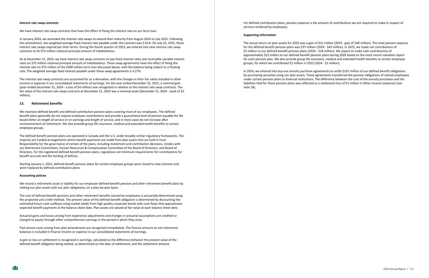 Interest rate swap contracts We have interest rate swap contracts that have the effect of fixing the interest rate on our term loan. In January 2024, we amended the interest rate swaps to extend their maturity from August 2024 to July 2025. Following this amendment, the weighted average fixed interest rate payable under the contract was 2.61%. On July 25, 2025, these interest rate swaps expired per their terms. During the fourth quarter of 2025, we entered into new interest rate swap contracts to fix $75 million notional principal amount of indebtedness. As at December 31, 2025, we have interest rate swap contracts to pay fixed interest rates and receivable variable interest rates on $75 million notional principal amount of indebtedness. These swap agreements have the effect of fixing the interest rate on $75 million of the $300 million term loan discussed above, with the balance being subject to a floating rate. The weighted average fixed interest payable under these swap agreements is 3.27%. The interest rate swap contracts are accounted for as a derivative, with the changes in their fair value included in other income or expense in our consolidated statements of earnings. For the year ended December 31, 2025, a nominal gain (year ended December 31, 2024 - a loss of $4 million) was recognized in relation to the interest rate swap contracts. The fair value of the interest rate swap contracts at December 31, 2025 was a nominal asset (December 31, 2024 - asset of $2 million). 13. Retirement benefits We maintain defined benefit and defined contribution pension plans covering most of our employees. The defined benefit plans generally do not require employee contributions and provide a guaranteed level of pension payable for life based either on length of service or on earnings and length of service, and in most cases do not increase after commencement of retirement. We also provide group life insurance, medical and extended health benefits to certain employee groups. The defined benefit pension plans are operated in Canada and the U.S. under broadly similar regulatory frameworks. The majority are funded arrangements where benefit payments are made from plan assets that are held in trust. Responsibility for the governance of certain of the plans, including investment and contribution decisions, resides with our Retirement Committees, Human Resources & Compensation Committee of the Board of Directors, and Board of Directors. For the registered defined benefit pension plans, regulations set minimum requirements for contributions for benefit accruals and the funding of deficits. Starting January 1, 2022, defined benefit pension plans for certain employee groups were closed to new entrants and were replaced by defined contribution plans. Accounting policies We record a retirement asset or liability for our employee defined benefit pension and other retirement benefit plans by netting our plan assets with our plan obligations, on a plan-by-plan basis. The cost of defined benefit pensions and other retirement benefits earned by employees is actuarially determined using the projected unit credit method. The present value of the defined benefit obligation is determined by discounting the estimated future cash outflows using market yields from high quality corporate bonds with cash flows that approximate expected benefit payments at the balance sheet date. Plan assets are valued at fair value at each balance sheet date. Actuarial gains and losses arising from experience adjustments and changes in actuarial assumptions are credited or charged to equity through other comprehensive earnings in the period in which they arise. Past service costs arising from plan amendments are recognized immediately. The finance amount on net retirement balances is included in finance income or expense in our consolidated statements of earnings. A gain or loss on settlement is recognized in earnings, calculated as the difference between the present value of the defined benefit obligation being settled, as determined on the date of settlement, and the settlement amount. -22- For defined contribution plans, pension expense is the amount of contributions we are required to make in respect of services rendered by employees. Supporting information The actual return on plan assets for 2025 was a gain of $31 million (2024 - gain of $40 million). The total pension expense for the defined benefit pension plans was $37 million (2024 - $43 million). In 2025, we made net contributions of $2 million to our defined benefit pension plans (2024 - $18 million). We expect to make cash contributions of approximately $22 million to our defined benefit pension plans during 2026 based on the most recent valuation report for each pension plan. We also provide group life insurance, medical and extended health benefits to certain employee groups, for which we contributed $1 million in 2025 (2024 - $1 million). In 2024, we entered into buy-out annuity purchase agreements to settle $101 million of our defined benefit obligations by purchasing annuities using our plan assets. These agreements transferred the pension obligations of retired employees under certain pension plans to financial institutions. The difference between the cost of the annuity purchases and the liabilities held for these pension plans was reflected as a settlement loss of $1 million in Other income (expense) (see note 18). -23- 2025 Annual Report | 113