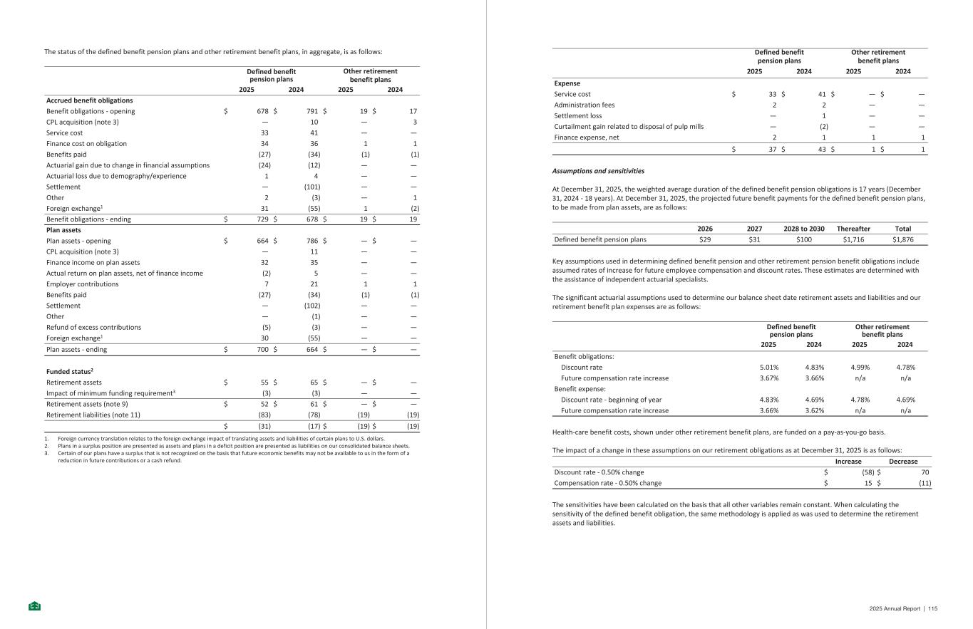 The status of the defined benefit pension plans and other retirement benefit plans, in aggregate, is as follows: Defined benefit pension plans Other retirement benefit plans 2025 2024 2025 2024 Accrued benefit obligations Benefit obligations - opening $ 678 $ 791 $ 19 $ 17 CPL acquisition (note 3) — 10 — 3 Service cost 33 41 — — Finance cost on obligation 34 36 1 1 Benefits paid (27) (34) (1) (1) Actuarial gain due to change in financial assumptions (24) (12) — — Actuarial loss due to demography/experience 1 4 — — Settlement — (101) — — Other 2 (3) — 1 Foreign exchange1 31 (55) 1 (2) Benefit obligations - ending $ 729 $ 678 $ 19 $ 19 Plan assets Plan assets - opening $ 664 $ 786 $ — $ — CPL acquisition (note 3) — 11 — — Finance income on plan assets 32 35 — — Actual return on plan assets, net of finance income (2) 5 — — Employer contributions 7 21 1 1 Benefits paid (27) (34) (1) (1) Settlement — (102) — — Other — (1) — — Refund of excess contributions (5) (3) — — Foreign exchange1 30 (55) — — Plan assets - ending $ 700 $ 664 $ — $ — Funded status2 Retirement assets $ 55 $ 65 $ — $ — Impact of minimum funding requirement3 (3) (3) — — Retirement assets (note 9) $ 52 $ 61 $ — $ — Retirement liabilities (note 11) (83) (78) (19) (19) $ (31) (17) $ (19) $ (19) 1. Foreign currency translation relates to the foreign exchange impact of translating assets and liabilities of certain plans to U.S. dollars. 2. Plans in a surplus position are presented as assets and plans in a deficit position are presented as liabilities on our consolidated balance sheets. 3. Certain of our plans have a surplus that is not recognized on the basis that future economic benefits may not be available to us in the form of a reduction in future contributions or a cash refund. -24- Defined benefit pension plans Other retirement benefit plans 2025 2024 2025 2024 Expense Service cost $ 33 $ 41 $ — $ — Administration fees 2 2 — — Settlement loss — 1 — — Curtailment gain related to disposal of pulp mills — (2) — — Finance expense, net 2 1 1 1 $ 37 $ 43 $ 1 $ 1 Assumptions and sensitivities At December 31, 2025, the weighted average duration of the defined benefit pension obligations is 17 years (December 31, 2024 - 18 years). At December 31, 2025, the projected future benefit payments for the defined benefit pension plans, to be made from plan assets, are as follows: 2026 2027 2028 to 2030 Thereafter Total Defined benefit pension plans $29 $31 $100 $1,716 $1,876 Key assumptions used in determining defined benefit pension and other retirement pension benefit obligations include assumed rates of increase for future employee compensation and discount rates. These estimates are determined with the assistance of independent actuarial specialists. The significant actuarial assumptions used to determine our balance sheet date retirement assets and liabilities and our retirement benefit plan expenses are as follows: Defined benefit pension plans Other retirement benefit plans 2025 2024 2025 2024 Benefit obligations: Discount rate 5.01% 4.83% 4.99% 4.78% Future compensation rate increase 3.67% 3.66% n/a n/a Benefit expense: Discount rate - beginning of year 4.83% 4.69% 4.78% 4.69% Future compensation rate increase 3.66% 3.62% n/a n/a Health-care benefit costs, shown under other retirement benefit plans, are funded on a pay-as-you-go basis. The impact of a change in these assumptions on our retirement obligations as at December 31, 2025 is as follows: Increase Decrease Discount rate - 0.50% change $ (58) $ 70 Compensation rate - 0.50% change $ 15 $ (11) The sensitivities have been calculated on the basis that all other variables remain constant. When calculating the sensitivity of the defined benefit obligation, the same methodology is applied as was used to determine the retirement assets and liabilities. -25- 2025 Annual Report | 115