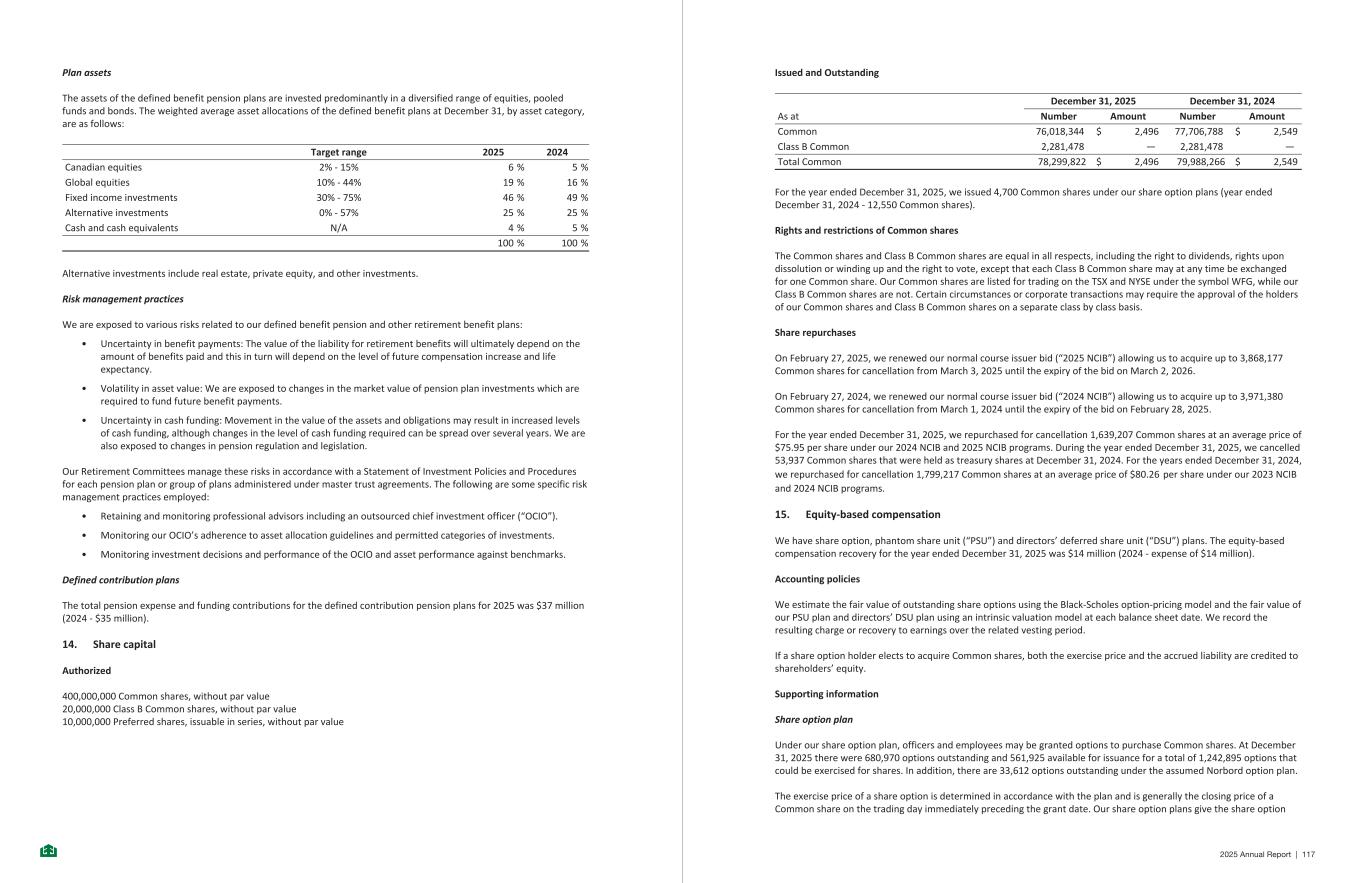 Plan assets The assets of the defined benefit pension plans are invested predominantly in a diversified range of equities, pooled funds and bonds. The weighted average asset allocations of the defined benefit plans at December 31, by asset category, are as follows: Target range 2025 2024 Canadian equities 2% - 15% 6 % 5 % Global equities 10% - 44% 19 % 16 % Fixed income investments 30% - 75% 46 % 49 % Alternative investments 0% - 57% 25 % 25 % Cash and cash equivalents N/A 4 % 5 % 100 % 100 % Alternative investments include real estate, private equity, and other investments. Risk management practices We are exposed to various risks related to our defined benefit pension and other retirement benefit plans: • Uncertainty in benefit payments: The value of the liability for retirement benefits will ultimately depend on the amount of benefits paid and this in turn will depend on the level of future compensation increase and life expectancy. • Volatility in asset value: We are exposed to changes in the market value of pension plan investments which are required to fund future benefit payments. • Uncertainty in cash funding: Movement in the value of the assets and obligations may result in increased levels of cash funding, although changes in the level of cash funding required can be spread over several years. We are also exposed to changes in pension regulation and legislation. Our Retirement Committees manage these risks in accordance with a Statement of Investment Policies and Procedures for each pension plan or group of plans administered under master trust agreements. The following are some specific risk management practices employed: • Retaining and monitoring professional advisors including an outsourced chief investment officer (“OCIO”). • Monitoring our OCIO’s adherence to asset allocation guidelines and permitted categories of investments. • Monitoring investment decisions and performance of the OCIO and asset performance against benchmarks. Defined contribution plans The total pension expense and funding contributions for the defined contribution pension plans for 2025 was $37 million (2024 - $35 million). 14. Share capital Authorized 400,000,000 Common shares, without par value 20,000,000 Class B Common shares, without par value 10,000,000 Preferred shares, issuable in series, without par value -26- Issued and Outstanding December 31, 2025 December 31, 2024 As at Number Amount Number Amount Common 76,018,344 $ 2,496 77,706,788 $ 2,549 Class B Common 2,281,478 — 2,281,478 — Total Common 78,299,822 $ 2,496 79,988,266 $ 2,549 For the year ended December 31, 2025, we issued 4,700 Common shares under our share option plans (year ended December 31, 2024 - 12,550 Common shares). Rights and restrictions of Common shares The Common shares and Class B Common shares are equal in all respects, including the right to dividends, rights upon dissolution or winding up and the right to vote, except that each Class B Common share may at any time be exchanged for one Common share. Our Common shares are listed for trading on the TSX and NYSE under the symbol WFG, while our Class B Common shares are not. Certain circumstances or corporate transactions may require the approval of the holders of our Common shares and Class B Common shares on a separate class by class basis. Share repurchases On February 27, 2025, we renewed our normal course issuer bid (“2025 NCIB”) allowing us to acquire up to 3,868,177 Common shares for cancellation from March 3, 2025 until the expiry of the bid on March 2, 2026. On February 27, 2024, we renewed our normal course issuer bid (“2024 NCIB”) allowing us to acquire up to 3,971,380 Common shares for cancellation from March 1, 2024 until the expiry of the bid on February 28, 2025. For the year ended December 31, 2025, we repurchased for cancellation 1,639,207 Common shares at an average price of $75.95 per share under our 2024 NCIB and 2025 NCIB programs. During the year ended December 31, 2025, we cancelled 53,937 Common shares that were held as treasury shares at December 31, 2024. For the years ended December 31, 2024, we repurchased for cancellation 1,799,217 Common shares at an average price of $80.26 per share under our 2023 NCIB and 2024 NCIB programs. 15. Equity-based compensation We have share option, phantom share unit (“PSU”) and directors’ deferred share unit (“DSU”) plans. The equity-based compensation recovery for the year ended December 31, 2025 was $14 million (2024 - expense of $14 million). Accounting policies We estimate the fair value of outstanding share options using the Black-Scholes option-pricing model and the fair value of our PSU plan and directors’ DSU plan using an intrinsic valuation model at each balance sheet date. We record the resulting charge or recovery to earnings over the related vesting period. If a share option holder elects to acquire Common shares, both the exercise price and the accrued liability are credited to shareholders’ equity. Supporting information Share option plan Under our share option plan, officers and employees may be granted options to purchase Common shares. At December 31, 2025 there were 680,970 options outstanding and 561,925 available for issuance for a total of 1,242,895 options that could be exercised for shares. In addition, there are 33,612 options outstanding under the assumed Norbord option plan. The exercise price of a share option is determined in accordance with the plan and is generally the closing price of a Common share on the trading day immediately preceding the grant date. Our share option plans give the share option -27- 2025 Annual Report | 117