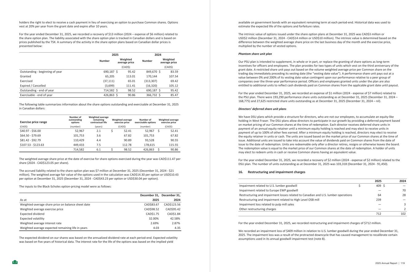 holders the right to elect to receive a cash payment in lieu of exercising an option to purchase Common shares. Options vest at 20% per year from the grant date and expire after 10 years. For the year ended December 31, 2025, we recorded a recovery of $13 million (2024 – expense of $6 million) related to the share option plan. The liability associated with the share option plan is tracked in Canadian dollars and is based on prices published by the TSX. A summary of the activity in the share option plans based on Canadian dollar prices is presented below: 2025 2024 Number Weighted average price Number Weighted average price (CAD$) (CAD$) Outstanding - beginning of year 690,187 $ 95.42 849,670 $ 83.59 Granted 65,205 113.01 170,144 107.54 Exercised (37,111) 65.01 (313,307) 69.42 Expired / Cancelled (3,699) 111.41 (16,320) 105.12 Outstanding - end of year 714,582 $ 98.52 690,187 $ 95.42 Exercisable - end of year 426,863 $ 90.86 366,732 $ 85.47 The following table summarizes information about the share options outstanding and exercisable at December 31, 2025 in Canadian dollars: $40.97 - $56.00 52,967 2.1 $ 52.41 52,967 $ 52.41 $64.50 - $79.69 101,753 3.6 67.82 101,753 67.82 $81.42 - $92.79 110,429 4.4 90.89 93,528 90.55 $107.53 - $123.63 449,433 7.5 112.78 178,615 115.55 714,582 6.1 $ 98.52 426,863 $ 90.86 Exercise price range Number of outstanding options Weighted average remaining contractual life Weighted average exercise price Number of exercisable options Weighted average exercise price (CAD$) (number) (years) (CAD$) (number) (CAD$) The weighted average share price at the date of exercise for share options exercised during the year was CAD$111.47 per share (2024 - CAD$123.05 per share). The accrued liability related to the share option plan was $7 million at December 31, 2025 (December 31, 2024 - $21 million). The weighted average fair value of the options used in the calculation was CAD$14.30 per option or USD$10.43 per option at December 31, 2025 (December 31, 2024 - CAD$43.23 per option or USD$30.04 per option). The inputs to the Black-Scholes option-pricing model were as follows: December 31, December 31, As at 2025 2024 Weighted-average share price on balance sheet date CAD$83.67 CAD$123.56 Weighted average exercise price CAD$98.52 CAD$95.42 Expected dividend CAD$1.75 CAD$1.84 Expected volatility 32.00% 42.58% Weighted average interest rate 2.69% 2.87% Weighted average expected remaining life in years 4.03 4.35 The expected dividend on our shares was based on the annualized dividend rate at each period-end. Expected volatility was based on five years of historical data. The interest rate for the life of the options was based on the implied yield -28- available on government bonds with an equivalent remaining term at each period-end. Historical data was used to estimate the expected life of the options and forfeiture rates. The intrinsic value of options issued under the share option plans at December 31, 2025 was CAD$3 million or USD$2 million (December 31, 2024 - CAD$14 million or USD$10 million). The intrinsic value is determined based on the difference between the weighted average share price on the last business day of the month and the exercise price, multiplied by the number of vested options. Phantom share unit plan Our PSU plan is intended to supplement, in whole or in part, or replace the granting of share options as long-term incentives for officers and employees. The plan provides for two types of units which vest on the third anniversary of the grant date. A restricted share unit pays out based on the volume weighted average price per Common share on the trading day immediately preceding its vesting date (the “vesting date value”). A performance share unit pays out at a value between 0% and 200% of its vesting date value contingent upon our performance relative to a peer group of companies over the three-year performance period. Officers and employees granted units under the plan are also entitled to additional units to reflect cash dividends paid on Common shares from the applicable grant date until payout. For the year ended December 31, 2025, we recorded an expense of $1 million (2024 - expense of $7 million) related to the PSU plan. There were 193,290 performance share units outstanding as at December 31, 2025 (December 31, 2024 – 168,775) and 27,625 restricted share units outstanding as at December 31, 2025 (December 31, 2024 – nil). Directors’ deferred share unit plans We have DSU plans which provide a structure for directors, who are not our employees, to accumulate an equity-like holding in West Fraser. The DSU plans allow directors to participate in our growth by providing a deferred payment based on market pricing of our Common shares at the time of redemption. Each director receives deferred share units in payment of an annual equity retainer until a minimum equity holding is reached and may elect to receive units in payment of up to 100% of other fees earned. After a minimum equity holding is reached, directors may elect to receive the equity retainer in units or cash. The units are issued based on the market price of our Common shares at the time of issue. Additional units are issued to take into account the value of dividends paid on Common shares from the date of issue to the date of redemption. Units are redeemable only after a director retires, resigns or otherwise leaves the board. The redemption value is equal to the market price of our Common shares at the date of redemption. A holder of units may elect to redeem units in cash or receive Common shares having an equivalent value. For the year ended December 31, 2025, we recorded a recovery of $2 million (2024 - expense of $2 million) related to the DSU plan. The number of units outstanding as at December 31, 2025 was 103,318 (December 31, 2024 - 91,450). 16. Restructuring and impairment charges 2025 2024 Impairment related to U.S. lumber goodwill $ 409 $ — Impairment related to Europe EW