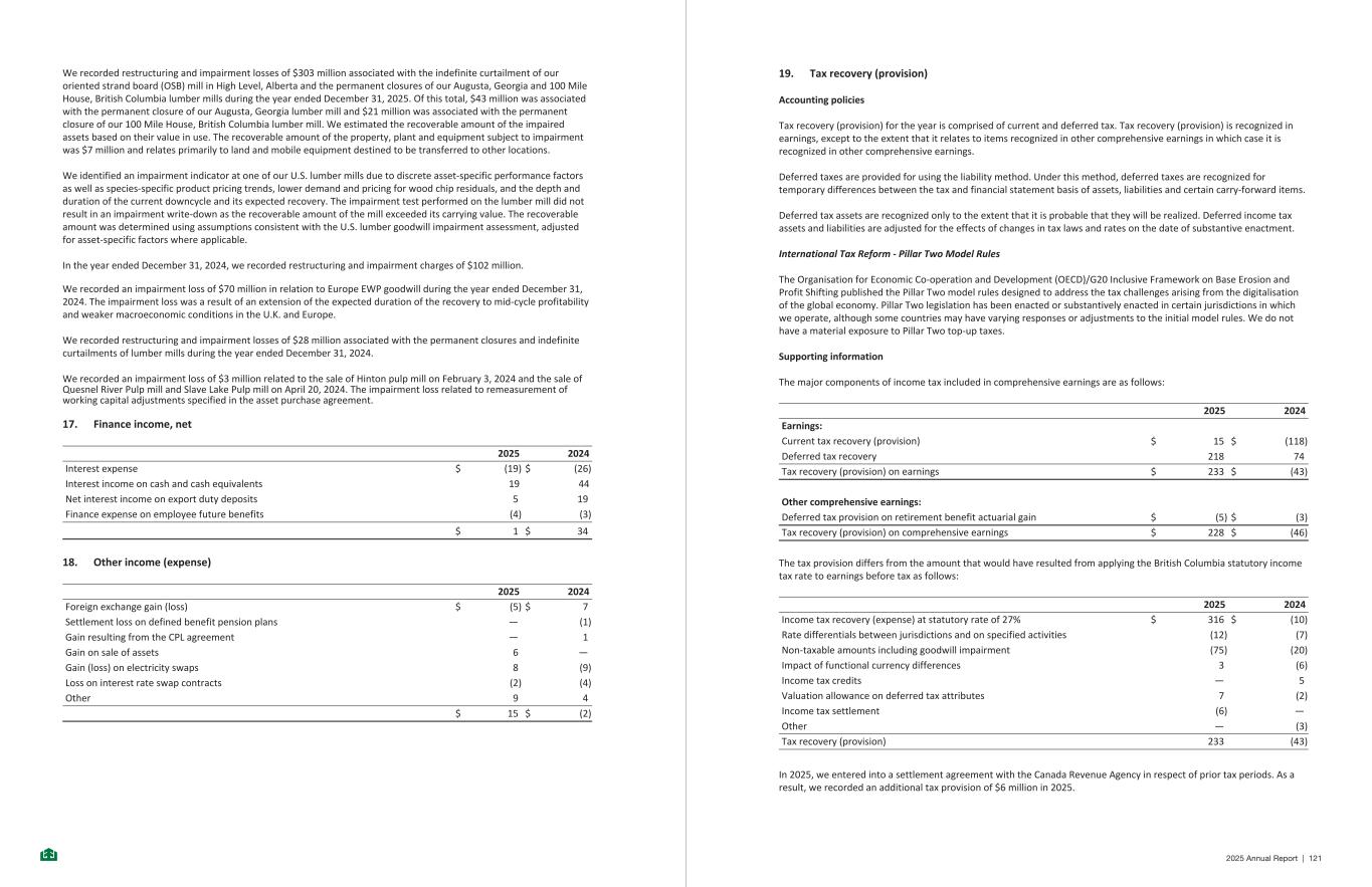 We recorded restructuring and impairment losses of $303 million associated with the indefinite curtailment of our oriented strand board (OSB) mill in High Level, Alberta and the permanent closures of our Augusta, Georgia and 100 Mile House, British Columbia lumber mills during the year ended December 31, 2025. Of this total, $43 million was associated with the permanent closure of our Augusta, Georgia lumber mill and $21 million was associated with the permanent closure of our 100 Mile House, British Columbia lumber mill. We estimated the recoverable amount of the impaired assets based on their value in use. The recoverable amount of the property, plant and equipment subject to impairment was $7 million and relates primarily to land and mobile equipment destined to be transferred to other locations. We identified an impairment indicator at one of our U.S. lumber mills due to discrete asset-specific performance factors as well as species-specific product pricing trends, lower demand and pricing for wood chip residuals, and the depth and duration of the current downcycle and its expected recovery. The impairment test performed on the lumber mill did not result in an impairment write-down as the recoverable amount of the mill exceeded its carrying value. The recoverable amount was determined using assumptions consistent with the U.S. lumber goodwill impairment assessment, adjusted for asset-specific factors where applicable. In the year ended December 31, 2024, we recorded restructuring and impairment charges of $102 million. We recorded an impairment loss of $70 million in relation to Europe EWP goodwill during the year ended December 31, 2024. The impairment loss was a result of an extension of the expected duration of the recovery to mid-cycle profitability and weaker macroeconomic conditions in the U.K. and Europe. We recorded restructuring and impairment losses of $28 million associated with the permanent closures and indefinite curtailments of lumber mills during the year ended December 31, 2024. We recorded an impairment loss of $3 million related to the sale of Hinton pulp mill on February 3, 2024 and the sale of Quesnel River Pulp mill and Slave Lake Pulp mill on April 20, 2024. The impairment loss related to remeasurement of working capital adjustments specified in the asset purchase agreement. 17. Finance income, net 2025 2024 Interest expense $ (19) $ (26) Interest income on cash and cash equivalents 19 44 Net interest income on export duty deposits 5 19 Finance expense on employee future benefits (4) (3) $ 1 $ 34 18. Other income (expense) 2025 2024 Foreign exchange gain (loss) $ (5) $ 7 Settlement loss on defined benefit pension plans — (1) Gain resulting from the CPL agreement — 1 Gain on sale of assets 6 — Gain (loss) on electricity swaps 8 (9) Loss on interest rate swap contracts (2) (4) Other 9 4 $ 15 $ (2) -30- 19. Tax recovery (provision) Accounting policies Tax recovery (provision) for the year is comprised of current and deferred tax. Tax recovery (provision) is recognized in earnings, except to the extent that it relates to items recognized in other comprehensive earnings in which case it is recognized in other comprehensive earnings. Deferred taxes are provided for using the liability method. Under this method, deferred taxes are recognized for temporary differences between the tax and financial statement basis of assets, liabilities and certain carry-forward items. Deferred tax assets are recognized only to the extent that it is probable that they will be realized. Deferred income tax assets and liabilities are adjusted for the effects of changes in tax laws and rates on the date of substantive enactment. International Tax Reform - Pillar Two Model Rules The Organisation for Economic Co-operation and Development (OECD)/G20 Inclusive Framework on Base Erosion and Profit Shifting published the Pillar Two model rules designed to address the tax challenges arising from the digitalisation of the global economy. Pillar Two legislation has been enacted or substantively enacted in certain jurisdictions in which we operate, although some countries may have varying responses or adjustments to the initial model rules. We do not have a material exposure to Pillar Two top-up taxes. Supporting information The major components of income tax included in comprehensive earnings are as follows: 2025 2024 Earnings: Current tax recovery (provision) $ 15 $ (118) Deferred tax recovery 218 74 Tax recovery (provision) on earnings $ 233 $ (43) Other comprehensive earnings: Deferred tax provision on retirement benefit actuarial gain $ (5) $ (3) Tax recovery (provision) on comprehensive earnings $ 228 $ (46) The tax provision differs from the amount that would have resulted from applying the British Columbia statutory income tax rate to earnings before tax as follows: 2025 2024 Income tax recovery (expense) at statutory rate of 27% $ 316 $ (10) Rate differentials between jurisdictions and on specified activities (12) (7) Non-taxable amounts including goodwill impairment (75) (20) Impact of functional currency differences 3 (6) Income tax credits — 5 Valuation allowance on deferred tax attributes 7 (2) Income tax settlement (6) — Other — (3) Tax recovery (provision) 233 (43) In 2025, we entered into a settlement agreement with the Canada Revenue Agency in respect of prior tax periods. As a result, we recorded an additional tax provision of $6 million in 2025. -31- 2025 Annual Report | 121