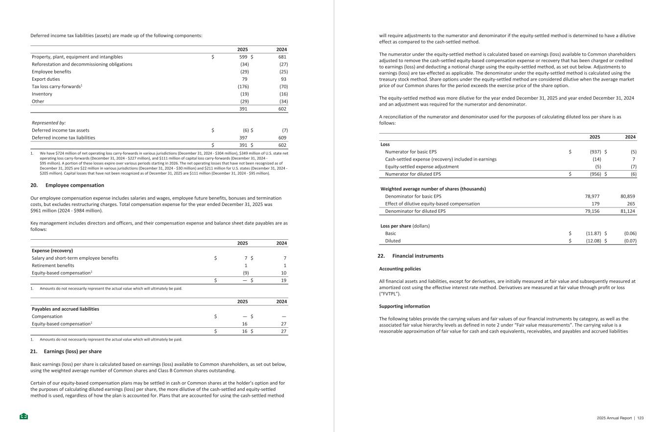 Deferred income tax liabilities (assets) are made up of the following components: 2025 2024 Property, plant, equipment and intangibles $ 599 $ 681 Reforestation and decommissioning obligations (34) (27) Employee benefits (29) (25) Export duties 79 93 Tax loss carry-forwards1 (176) (70) Inventory (19) (16) Other (29) (34) 391 602 Represented by: Deferred income tax assets $ (6) $ (7) Deferred income tax liabilities 397 609 $ 391 $ 602 1. We have $724 million of net operating loss carry-forwards in various jurisdictions (December 31, 2024 - $304 million), $349 million of U.S. state net operating loss carry-forwards (December 31, 2024 - $227 million), and $111 million of capital loss carry-forwards (December 31, 2024 - $95 million). A portion of these losses expire over various periods starting in 2026. The net operating losses that have not been recognized as of December 31, 2025 are $22 million in various jurisdictions (December 31, 2024 - $30 million) and $211 million for U.S. states (December 31, 2024 - $205 million). Capital losses that have not been recognized as of December 31, 2025 are $111 million (December 31, 2024 - $95 million). 20. Employee compensation Our employee compensation expense includes salaries and wages, employee future benefits, bonuses and termination costs, but excludes restructuring charges. Total compensation expense for the year ended December 31, 2025 was $961 million (2024 - $984 million). Key management includes directors and officers, and their compensation expense and balance sheet date payables are as follows: 2025 2024 Expense (recovery) Salary and short-term employee benefits $ 7 $ 7 Retirement benefits 1 1 Equity-based compensation1 (9) 10 $ — $ 19 1. Amounts do not necessarily represent the actual value which will ultimately be paid. 2025 2024 Payables and accrued liabilities Compensation $ — $ — Equity-based compensation1 16 27 $ 16 $ 27 1. Amounts do not necessarily represent the actual value which will ultimately be paid. 21. Earnings (loss) per share Basic earnings (loss) per share is calculated based on earnings (loss) available to Common shareholders, as set out below, using the weighted average number of Common shares and Class B Common shares outstanding. Certain of our equity-based compensation plans may be settled in cash or Common shares at the holder’s option and for the purposes of calculating diluted earnings (loss) per share, the more dilutive of the cash-settled and equity-settled method is used, regardless of how the plan is accounted for. Plans that are accounted for using the cash-settled method -32- will require adjustments to the numerator and denominator if the equity-settled method is determined to have a dilutive effect as compared to the cash-settled method. The numerator under the equity-settled method is calculated based on earnings (loss) available to Common shareholders adjusted to remove the cash-settled equity-based compensation expense or recovery that has been charged or credited to earnings (loss) and deducting a notional charge using the equity-settled method, as set out below. Adjustments to earnings (loss) are tax-effected as applicable. The denominator under the equity-settled method is calculated using the treasury stock method. Share options under the equity-settled method are considered dilutive when the average market price of our Common shares for the period exceeds the exercise price of the share option. The equity-settled method was more dilutive for the year ended December 31, 2025 and year ended December 31, 2024 and an adjustment was required for the numerator and denominator. A reconciliation of the numerator and denominator used for the purposes of calculating diluted loss per share is as follows: 2025 2024 Loss Numerator for basic EPS $ (937) $ (5) Cash-settled expense (recovery) included in earnings (14) 7 Equity-settled expense adjustment (5) (7) Numerator for diluted EPS $ (956) $ (6) Weighted average number of shares (thousands) Denominator for basic EPS 78,977 80,859 Effect of dilutive equity-based compensation 179 265 Denominator for diluted EPS 79,156 81,124 Loss per share (dollars) Basic $ (11.87) $ (0.06) Diluted $ (12.08) $ (0.07) 22. Financial instruments Accounting policies All financial assets and liabilities, except for derivatives, are initially measured at fair value and subsequently measured at amortized cost using the effective interest rate method. Derivatives are measured at fair value through profit or loss (“FVTPL”). Supporting information The following tables provide the carrying values and fair values of our financial instruments by category, as well as the associated fair value hierarchy levels as defined in note 2 under “Fair value measurements”. The carrying value is a reasonable approximation of fair value for cash and cash equivalents, receivables, and payables and accrued liabilities -33- 2025 Annual Report | 123