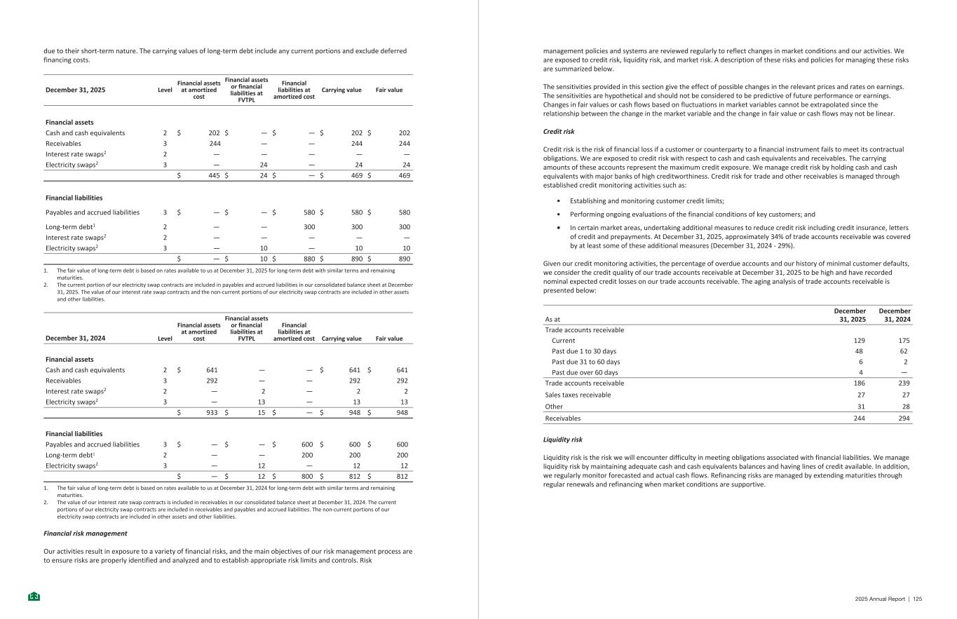 due to their short-term nature. The carrying values of long-term debt include any current portions and exclude deferred financing costs. December 31, 2025 Level Financial assets at amortized cost Financial assets or financial liabilities at FVTPL Financial liabilities at amortized cost Carrying value Fair value Financial assets Cash and cash equivalents 2 $ 202 $ — $ — $ 202 $ 202 Receivables 3 244 — — 244 244 Interest rate swaps2 2 — — — — — Electricity swaps2 3 — 24 — 24 24 $ 445 $ 24 $ — $ 469 $ 469 Financial liabilities Payables and accrued liabilities 3 $ — $ — $ 580 $ 580 $ 580 Long-term debt1 2 — — 300 300 300 Interest rate swaps2 2 — — — — — Electricity swaps2 3 — 10 — 10 10 $ — $ 10 $ 880 $ 890 $ 890 1. The fair value of long-term debt is based on rates available to us at December 31, 2025 for long-term debt with similar terms and remaining maturities. 2. The current portion of our electricity swap contracts are included in payables and accrued liabilities in our consolidated balance sheet at December 31, 2025. The value of our interest rate swap contracts and the non-current portions of our electricity swap contracts are included in other assets and other liabilities. December 31, 2024 Level Financial assets at amortized cost Financial assets or financial liabilities at FVTPL Financial liabilities at amortized cost Carrying value Fair value Financial assets Cash and cash equivalents 2 $ 641 — — $ 641 $ 641 Receivables 3 292 — — 292 292 Interest rate swaps2 2 — 2 — 2 2 Electricity swaps2 3 — 13 — 13 13 $ 933 $ 15 $ — $ 948 $ 948 Financial liabilities Payables and accrued liabilities 3 $ — $ — $ 600 $ 600 $ 600 Long-term debt1 2 — — 200 200 200 Electricity swaps2 3 — 12 — 12 12 $ — $ 12 $ 800 $ 812 $ 812 1. The fair value of long-term debt is based on rates available to us at December 31, 2024 for long-term debt with similar terms and remaining maturities. 2. The value of our interest rate swap contracts is included in receivables in our consolidated balance sheet at December 31, 2024. The current portions of our electricity swap contracts are included in receivables and payables and accrued liabilities. The non-current portions of our electricity swap contracts are included in other assets and other liabilities. Financial risk management Our activities result in exposure to a variety of financial risks, and the main objectives of our risk management process are to ensure risks are properly identified and analyzed and to establish appropriate risk limits and controls. Risk -34- management policies and systems are reviewed regularly to reflect changes in market conditions and our activities. We are exposed to credit risk, liquidity risk, and market risk. A description of these risks and policies for managing these risks are summarized below. The sensitivities provided in this section give the effect of possible changes in the relevant prices and rates on earnings. The sensitivities are hypothetical and should not be considered to be predictive of future performance or earnings. Changes in fair values or cash flows based on fluctuations in market variables cannot be extrapolated since the relationship between the change in the market variable and the change in fair value or cash flows may not be linear. Credit risk Credit risk is the risk of financial loss if a customer or counterparty to a financial instrument fails to meet its contractual obligations. We are exposed to credit risk with respect to cash and cash equivalents and receivables. The carrying amounts of these accounts represent the maximum credit exposure. We manage credit risk by holding cash and cash equivalents with major banks of high creditworthiness. Credit risk for trade and other receivables is managed through established credit monitoring activities such as: • Establishing and monitoring customer credit limits; • Performing ongoing evaluations of the financial conditions of key customers; and • In certain market areas, undertaking additional measures to reduce credit risk including credit insurance, letters of credit and prepayments. At December 31, 2025, approximately 34% of trade accounts receivable was covered by at least some of these additional measures (December 31, 2024 - 29%). Given our credit monitoring activities, the percentage of overdue accounts and our history of minimal customer defaults, we consider the credit quality of our trade accounts receivable at December 31, 2025 to be high and have recorded nominal expected credit losses on our trade accounts receivable. The aging analysis of trade accounts receivable is presented below: As at December 31, 2025 December 31, 2024 Trade accounts receivable Current 129 175 Past due 1 to 30 days 48 62 Past due 31 to 60 days 6 2 Past due over 60 days 4 — Trade accounts receivable 186 239 Sales taxes receivable 27 27 Other 31 28 Receivables 244 294 Liquidity risk Liquidity risk is the risk we will encounter difficulty in meeting obligations associated with financial liabilities. We manage liquidity risk by maintaining adequate cash and cash equivalents balances and having lines of credit available. In addition, we regularly monitor forecasted and actual cash flows. Refinancing risks are managed by extending maturities through regular renewals and refinancing when market conditions are supportive. -35- 2025 Annual Report | 125