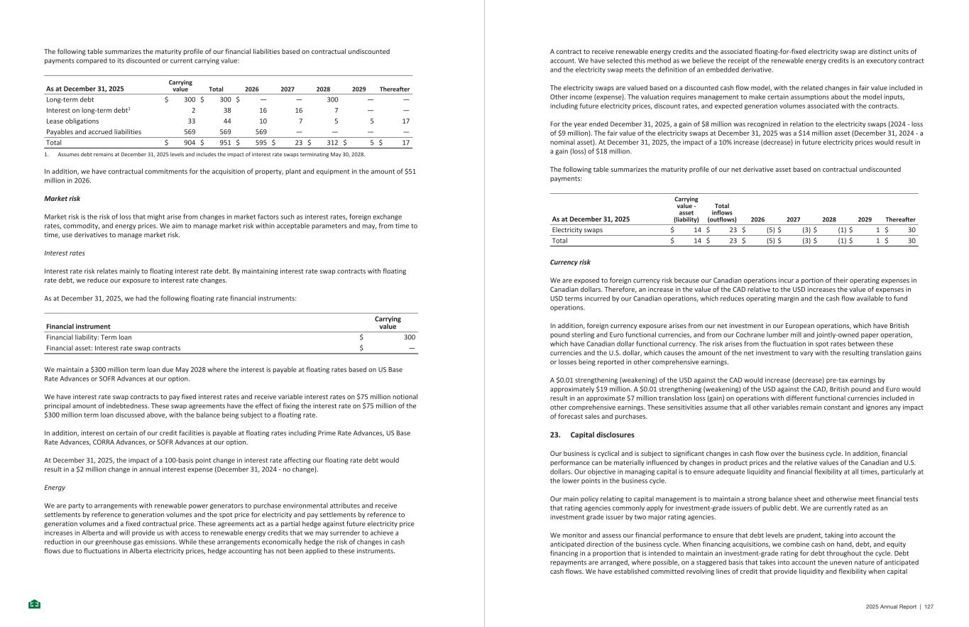The following table summarizes the maturity profile of our financial liabilities based on contractual undiscounted payments compared to its discounted or current carrying value: As at December 31, 2025 Carrying value Total 2026 2027 2028 2029 Thereafter Long-term debt $ 300 $ 300 $ — — 300 — — Interest on long-term debt1 2 38 16 16 7 — — Lease obligations 33 44 10 7 5 5 17 Payables and accrued liabilities 569 569 569 — — — — Total $ 904 $ 951 $ 595 $ 23 $ 312 $ 5 $ 17 1. Assumes debt remains at December 31, 2025 levels and includes the impact of interest rate swaps terminating May 30, 2028. In addition, we have contractual commitments for the acquisition of property, plant and equipment in the amount of $51 million in 2026. Market risk Market risk is the risk of loss that might arise from changes in market factors such as interest rates, foreign exchange rates, commodity, and energy prices. We aim to manage market risk within acceptable parameters and may, from time to time, use derivatives to manage market risk. Interest rates Interest rate risk relates mainly to floating interest rate debt. By maintaining interest rate swap contracts with floating rate debt, we reduce our exposure to interest rate changes. As at December 31, 2025, we had the following floating rate financial instruments: Financial instrument Carrying value Financial liability: Term loan $ 300 Financial asset: Interest rate swap contracts $ — We maintain a $300 million term loan due May 2028 where the interest is payable at floating rates based on US Base Rate Advances or SOFR Advances at our option. We have interest rate swap contracts to pay fixed interest rates and receive variable interest rates on $75 million notional principal amount of indebtedness. These swap agreements have the effect of fixing the interest rate on $75 million of the $300 million term loan discussed above, with the balance being subject to a floating rate. In addition, interest on certain of our credit facilities is payable at floating rates including Prime Rate Advances, US Base Rate Advances, CORRA Advances, or SOFR Advances at our option. At December 31, 2025, the impact of a 100-basis point change in interest rate affecting our floating rate debt would result in a $2 million change in annual interest expense (December 31, 2024 - no change). Energy We are party to arrangements with renewable power generators to purchase environmental attributes and receive settlements by reference to generation volumes and the spot price for electricity and pay settlements by reference to generation volumes and a fixed contractual price. These agreements act as a partial hedge against future electricity price increases in Alberta and will provide us with access to renewable energy credits that we may surrender to achieve a reduction in our greenhouse gas emissions. While these arrangements economically hedge the risk of changes in cash flows due to fluctuations in Alberta electricity prices, hedge accounting has not been applied to these instruments. -36- A contract to receive renewable energy credits and the associated floating-for-fixed electricity swap are distinct units of account. We have selected this method as we believe the receipt of the renewable energy credits is an executory contract and the electricity swap meets the definition of an embedded derivative. The electricity swaps are valued based on a discounted cash flow model, with the related changes in fair value included in Other income (expense). The valuation requires management to make certain assumptions about the model inputs, including future electricity prices, discount rates, and expected generation volumes associated with the contracts. For the year ended December 31, 2025, a gain of $8 million was recognized in relation to the electricity swaps (2024 - loss of $9 million). The fair value of the electricity swaps at December 31, 2025 was a $14 million asset (December 31, 2024 - a nominal asset). At December 31, 2025, the impact of a 10% increase (decrease) in future electricity prices would result in a gain (loss) of $18 million. The following table summarizes the maturity profile of our net derivative asset based on contractual undiscounted payments: As at December 31, 2025 Carrying value - asset (liability) Total inflows (outflows) 2026 2027 2028 2029 Thereafter Electricity swaps $ 14 $ 23 $ (5) $ (3) $ (1) $ 1 $ 30 Total $ 14 $ 23 $ (5) $ (3) $ (1) $ 1 $ 30 Currency risk We are exposed to foreign currency risk because our Canadian operations incur a portion of their operating expenses in Canadian dollars. Therefore, an increase in the value of the CAD relative to the USD increases the value of expenses in USD terms incurred by our Canadian operations, which reduces operating margin and the cash flow available to fund operations. In addition, foreign currency exposure arises from our net investment in our European operations, which have British pound sterling and Euro functional currencies, and from our Cochrane lumber mill and jointly-owned paper operation, which have Canadian dollar functional currency. The risk arises from the fluctuation in spot rates between these currencies and the U.S. dollar, which causes the amount of the net investment to vary with the resulting translation gains or losses being reported in other comprehensive earnings. A $0.01 strengthening (weakening) of the USD against the CAD would increase (decrease) pre-tax earnings by approximately $19 million. A $0.01 strengthening (weakening) of the USD against the CAD, British pound and Euro would result in an approximate $7 million translation loss (gain) on operations with different functional currencies included in other comprehensive earnings. These sensitivities assume that all other variables remain constant and ignores any impact of forecast sales and purchases. 23. Capital disclosures Our business is cyclical and is subject to significant changes in cash flow over the business cycle. 