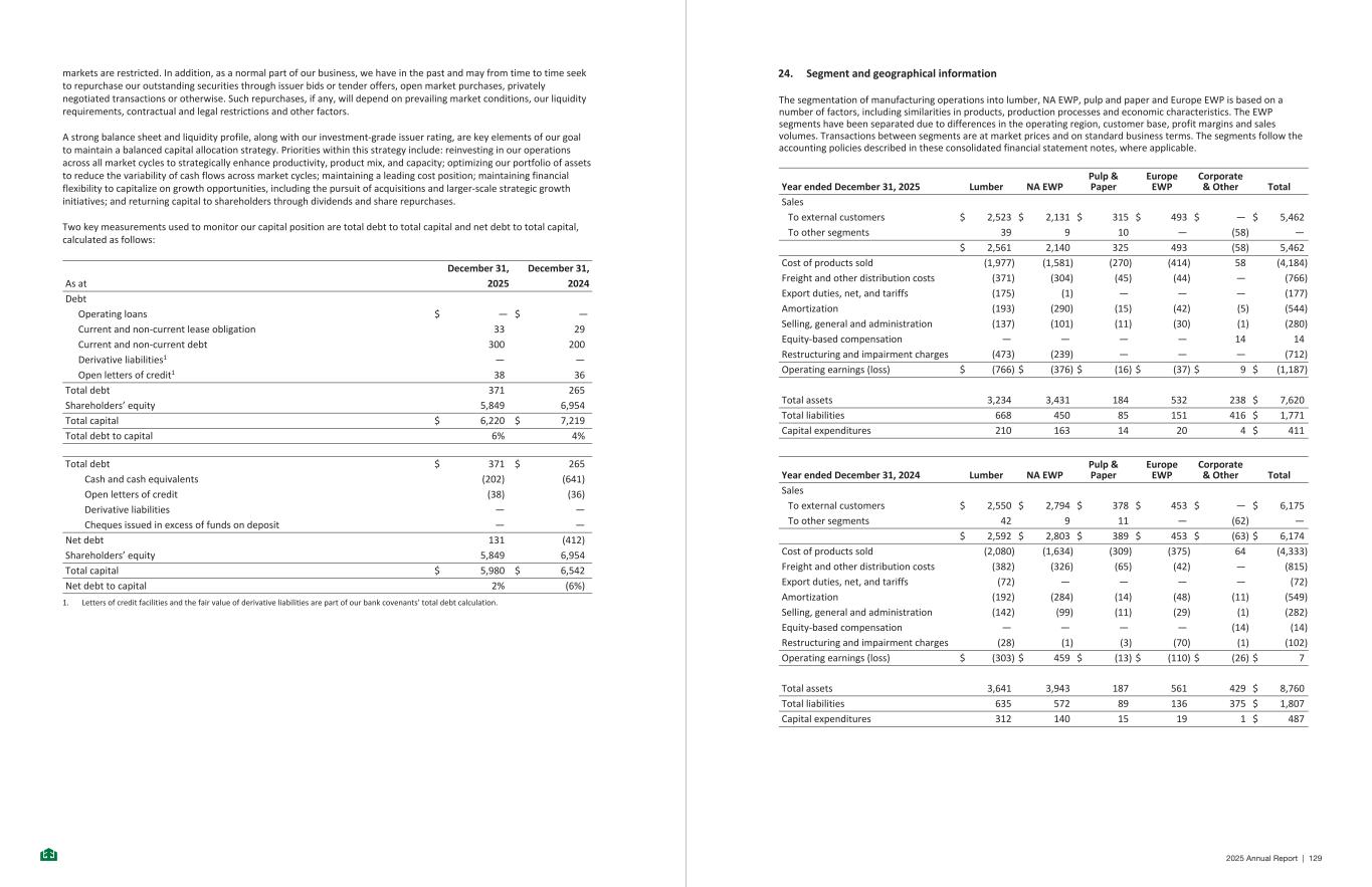 markets are restricted. In addition, as a normal part of our business, we have in the past and may from time to time seek to repurchase our outstanding securities through issuer bids or tender offers, open market purchases, privately negotiated transactions or otherwise. Such repurchases, if any, will depend on prevailing market conditions, our liquidity requirements, contractual and legal restrictions and other factors. A strong balance sheet and liquidity profile, along with our investment-grade issuer rating, are key elements of our goal to maintain a balanced capital allocation strategy. Priorities within this strategy include: reinvesting in our operations across all market cycles to strategically enhance productivity, product mix, and capacity; optimizing our portfolio of assets to reduce the variability of cash flows across market cycles; maintaining a leading cost position; maintaining financial flexibility to capitalize on growth opportunities, including the pursuit of acquisitions and larger-scale strategic growth initiatives; and returning capital to shareholders through dividends and share repurchases. Two key measurements used to monitor our capital position are total debt to total capital and net debt to total capital, calculated as follows: December 31, December 31, As at 2025 2024 Debt Operating loans $ — $ — Current and non-current lease obligation 33 29 Current and non-current debt 300 200 Derivative liabilities1 — — Open letters of credit1 38 36 Total debt 371 265 Shareholders’ equity 5,849 6,954 Total capital $ 6,220 $ 7,219 Total debt to capital 6% 4% Total debt $ 371 $ 265 Cash and cash equivalents (202) (641) Open letters of credit (38) (36) Derivative liabilities — — Cheques issued in excess of funds on deposit — — Net debt 131 (412) Shareholders’ equity 5,849 6,954 Total capital $ 5,980 $ 6,542 Net debt to capital 2% (6%) 1. Letters of credit facilities and the fair value of derivative liabilities are part of our bank covenants’ total debt calculation. -38- 24. Segment and geographical information The segmentation of manufacturing operations into lumber, NA EWP, pulp and paper and Europe EWP is based on a number of factors, including similarities in products, production processes and economic characteristics. The EWP segments have been separated due to differences in the operating region, customer base, profit margins and sales volumes. Transactions between segments are at market prices and on standard business terms. The segments follow the accounting policies described in these consolidated financial statement notes, where applicable. Year ended December 31, 2025 Lumber NA EWP Pulp & Paper Europe EWP Corporate & Other Total Sales To external customers $ 2,523 $ 2,131 $ 315 $ 493 $ — $ 5,462 To other segments 39 9 10 — (58) — $ 2,561 2,140 325 493 (58) 5,462 Cost of products sold (1,977) (1,581) (270) (414) 58 (4,184) Freight and other distribution costs (371) (304) (45) (44) — (766) Export duties, net, and tariffs (175) (1) — — — (177) Amortization (193) (290) (15) (42) (5) (544) Selling, general and administration (137) (101) (11) (30) (1) (280) Equity-based compensation — — — — 14 14 Restructuring and impairment charges (473) (239) — — — (712) Operating earnings (loss) $ (766) $ (376) $ (16) $ (37) $ 9 $ (1,187) Total assets 3,234 3,431 184 532 238 $ 7,620 Total liabilities 668 450 85 151 416 $ 1,771 Capital expenditures 210 163 14 20 4 $ 411 Lumber NA EWP Pulp & Paper Europe EWP Corporate & Other TotalYear ended December 31, 2024 Sales To external customers $ 2,550 $ 2,794 $ 378 $ 453 $ — $ 6,175 To other segments 42 9 11 — (62) — $ 2,592 $ 2,803 $ 389 $ 453 $ (63) $ 6,174 Cost of products sold (2,080) (1,634) (309) (375) 64 (4,333) Freight and other distribution costs (382) (326) (65) (42) — (815) Export duties, net, and tariffs (72) — — — — (72) Amortization (192) (284) (14) (48) (11) (549) Selling, general and administration (142) (99) (11) (29) (1) (282) Equity-based compensation — — — — (14) (14) Restructuring and impairment charges (28) (1) (3) (70) (1) (102) Operating earnings (loss) $ (303) $ 459 $ (13) $ (110) $ (26) $ 7 Total assets 3,641 3,943 187 561 429 $ 8,760 Total liabilities 635 572 89 136 375 $ 1,807 Capital expenditures 312 140 15 19 1 $ 487 -39- 2025 Annual Report | 129