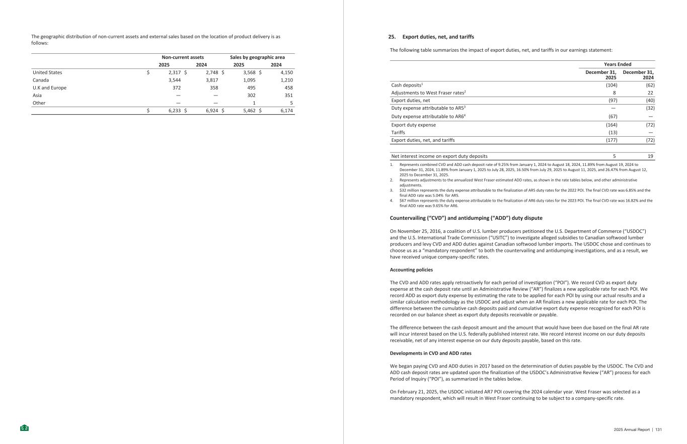 The geographic distribution of non-current assets and external sales based on the location of product delivery is as follows: Non-current assets Sales by geographic area 2025 2024 2025 2024 United States $ 2,317 $ 2,748 $ 3,568 $ 4,150 Canada 3,544 3,817 1,095 1,210 U.K and Europe 372 358 495 458 Asia — — 302 351 Other — — 1 5 $ 6,233 $ 6,924 $ 5,462 $ 6,174 -40- 25. Export duties, net, and tariffs The following table summarizes the impact of export duties, net, and tariffs in our earnings statement: Years Ended December 31, 2025 December 31, 2024 Cash deposits1 (104) (62) Adjustments to West Fraser rates2 8 22 Export duties, net (97) (40) Duty expense attributable to AR53 — (32) Duty expense attributable to AR64 (67) — Export duty expense (164) (72) Tariffs (13) — Export duties, net, and tariffs (177) (72) Net interest income on export duty deposits 5 19 1. Represents combined CVD and ADD cash deposit rate of 9.25% from January 1, 2024 to August 18, 2024, 11.89% from August 19, 2024 to December 31, 2024, 11.89% from January 1, 2025 to July 28, 2025, 16.50% from July 29, 2025 to August 11, 2025, and 26.47% from August 12, 2025 to December 31, 2025. 2. Represents adjustments to the annualized West Fraser estimated ADD rates, as shown in the rate tables below, and other administrative adjustments. 3. $32 million represents the duty expense attributable to the finalization of AR5 duty rates for the 2022 POI. The final CVD rate was 6.85% and the final ADD rate was 5.04% for AR5. 4. $67 million represents the duty expense attributable to the finalization of AR6 duty rates for the 2023 POI. The final CVD rate was 16.82% and the final ADD rate was 9.65% for AR6. Countervailing (“CVD”) and antidumping (“ADD”) duty dispute On November 25, 2016, a coalition of U.S. lumber producers petitioned the U.S. Department of Commerce (“USDOC”) and the U.S. International Trade Commission (“USITC”) to investigate alleged subsidies to Canadian softwood lumber producers and levy CVD and ADD duties against Canadian softwood lumber imports. The USDOC chose and continues to choose us as a “mandatory respondent” to both the countervailing and antidumping investigations, and as a result, we have received unique company-specific rates. Accounting policies The CVD and ADD rates apply retroactively for each period of investigation (“POI”). We record CVD as export duty expense at the cash deposit rate until an Administrative Review (“AR”) finalizes a new applicable rate for each POI. We record ADD as export duty expense by estimating the rate to be applied for each POI by using our actual results and a similar calculation methodology as the USDOC and adjust when an AR finalizes a new applicable rate for each POI. The difference between the cumulative cash deposits paid and cumulative export duty expense recognized for each POI is recorded on our balance sheet as export duty deposits receivable or payable. The difference between the cash deposit amount and the amount that would have been due based on the final AR rate will incur interest based on the U.S. federally published interest rate. We record interest income on our duty deposits receivable, net of any interest expense on our duty deposits payable, based on this rate. Developments in CVD and ADD rates We began paying CVD and ADD duties in 2017 based on the determination of duties payable by the USDOC. The CVD and ADD cash deposit rates are updated upon the finalization of the USDOC’s Administrative Review (“AR”) process for each Period of Inquiry (“POI”), as summarized in the tables below. On February 21, 2025, the USDOC initiated AR7 POI covering the 2024 calendar year. West Fraser was selected as a mandatory respondent, which will result in West Fraser continuing to be subject to a company-specific rate. -41- 2025 Annual Report | 131