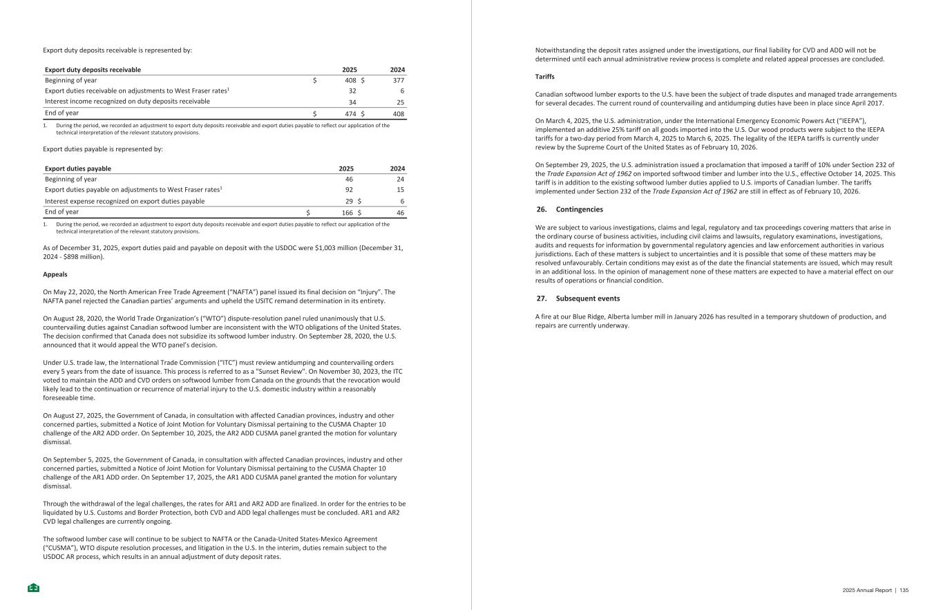 Export duty deposits receivable is represented by: Export duty deposits receivable 2025 2024 Beginning of year $ 408 $ 377 Export duties receivable on adjustments to West Fraser rates1 32 6 Interest income recognized on duty deposits receivable 34 25 End of year $ 474 $ 408 1. During the period, we recorded an adjustment to export duty deposits receivable and export duties payable to reflect our application of the technical interpretation of the relevant statutory provisions. Export duties payable is represented by: Export duties payable 2025 2024 Beginning of year 46 24 Export duties payable on adjustments to West Fraser rates1 92 15 Interest expense recognized on export duties payable 29 $ 6 End of year $ 166 $ 46 1. During the period, we recorded an adjustment to export duty deposits receivable and export duties payable to reflect our application of the technical interpretation of the relevant statutory provisions. As of December 31, 2025, export duties paid and payable on deposit with the USDOC were $1,003 million (December 31, 2024 - $898 million). Appeals On May 22, 2020, the North American Free Trade Agreement (“NAFTA”) panel issued its final decision on “Injury”. The NAFTA panel rejected the Canadian parties’ arguments and upheld the USITC remand determination in its entirety. On August 28, 2020, the World Trade Organization’s (“WTO”) dispute-resolution panel ruled unanimously that U.S. countervailing duties against Canadian softwood lumber are inconsistent with the WTO obligations of the United States. The decision confirmed that Canada does not subsidize its softwood lumber industry. On September 28, 2020, the U.S. announced that it would appeal the WTO panel’s decision. Under U.S. trade law, the International Trade Commission (“ITC”) must review antidumping and countervailing orders every 5 years from the date of issuance. This process is referred to as a "Sunset Review". On November 30, 2023, the ITC voted to maintain the ADD and CVD orders on softwood lumber from Canada on the grounds that the revocation would likely lead to the continuation or recurrence of material injury to the U.S. domestic industry within a reasonably foreseeable time. On August 27, 2025, the Government of Canada, in consultation with affected Canadian provinces, industry and other concerned parties, submitted a Notice of Joint Motion for Voluntary Dismissal pertaining to the CUSMA Chapter 10 challenge of the AR2 ADD order. On September 10, 2025, the AR2 ADD CUSMA panel granted the motion for voluntary dismissal. On September 5, 2025, the Government of Canada, in consultation with affected Canadian provinces, industry and other concerned parties, submitted a Notice of Joint Motion for Voluntary Dismissal pertaining to the CUSMA Chapter 10 challenge of the AR1 ADD order. On September 17, 2025, the AR1 ADD CUSMA panel granted the motion for voluntary dismissal. Through the withdrawal of the legal challenges, the rates for AR1 and AR2 ADD are finalized. In order for the entries to be liquidated by U.S. Customs and Border Protection, both CVD and ADD legal challenges must be concluded. AR1 and AR2 CVD legal challenges are currently ongoing. The softwood lumber case will continue to be subject to NAFTA or the Canada-United States-Mexico Agreement (“CUSMA”), WTO dispute resolution processes, and litigation in the U.S. In the interim, duties remain subject to the USDOC AR process, which results in an annual adjustment of duty deposit rates. -44- Notwithstanding the deposit rates assigned under the investigations, our final liability for CVD and ADD will not be determined until each annual administrative review process is complete and related appeal processes are concluded. Tariffs Canadian softwood lumber exports to the U.S. have been the subject of trade disputes and managed trade arrangements for several decades. The current round of countervailing and antidumping duties have been in place since April 2017. On March 4, 2025, the U.S. administration, under the International Emergency Economic Powers Act (“IEEPA”), implemented an additive 25% tariff on all goods imported into the U.S. Our wood products were subject to the IEEPA tariffs for a two-day period from March 4, 2025 to March 6, 2025. The legality of the IEEPA tariffs is currently under review by the Supreme Court of the United States as of February 10, 2026. On September 29, 2025, the U.S. administration issued a proclamation that imposed a tariff of 10% under Section 232 of the Trade Expansion Act of 1962 on imported softwood timber and lumber into the U.S., effective October 14, 2025. This tariff is in addition to the existing softwood lumber duties applied to U.S. imports of Canadian lumber. The tariffs implemented under Section 232 of the Trade Expansion Act of 1962 are still in effect as of February 10, 2026. 26. Contingencies We are subject to various investigations, claims and legal, regulatory and tax proceedings covering matters that arise in the ordinary course of business activities, including civil claims and lawsuits, regulatory examinations, investigations, audits and requests for information by governmental regulatory agencies and law enforcement authorities in various jurisdictions. Each of these matters is subject to uncertainties and it is possible that some of these matters may be resolved unfavourably. Certain conditions may exist as of the date the financial statements are issued, which may result in an additional loss. In the opinion of management none of these matters are expected to have a material effect on our results of operations or financial condition. 27. Subsequent events A fire at our Blue Ridge, Alberta lumber mill in January 2026 has resulted in a temporary shutdown of production, and repairs are currently underway. -45- 2025 Annual Report | 135
