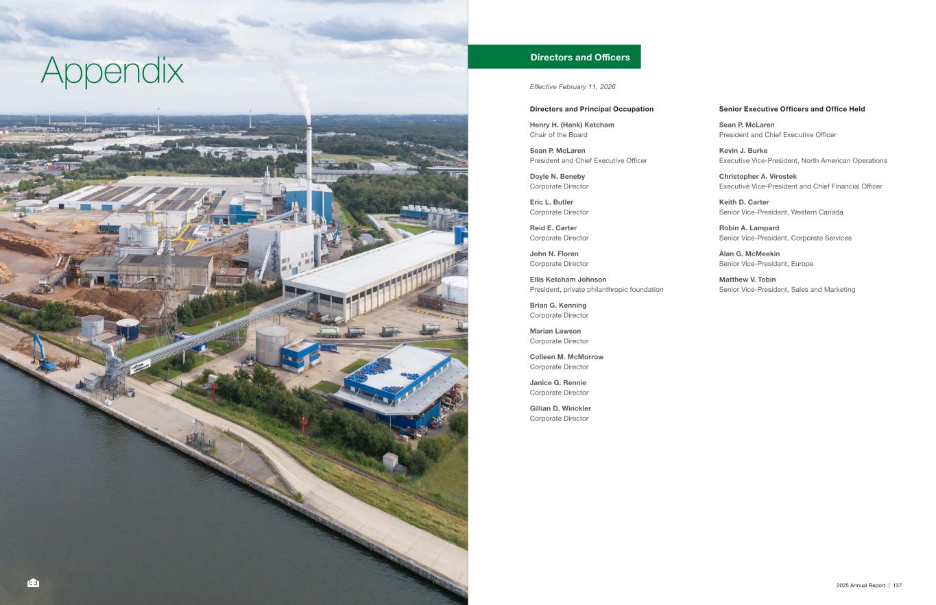 2025 Annual Report | 137 Appendix Directors and Officers Effective February 11, 2026 Directors and Principal Occupation Henry H. (Hank) Ketcham Chair of the Board Sean P. McLaren President and Chief Executive Officer Doyle N. Beneby Corporate Director Eric L. Butler Corporate Director Reid E. Carter Corporate Director John N. Floren Corporate Director Ellis Ketcham Johnson President, private philanthropic foundation Brian G. Kenning Corporate Director Marian Lawson Corporate Director Colleen M. McMorrow Corporate Director Janice G. Rennie Corporate Director Gillian D. Winckler Corporate Director Senior Executive Officers and Office Held Sean P. McLaren President and Chief Executive Officer Kevin J. Burke Executive Vice-President, North American Operations Christopher A. Virostek Executive Vice-President and Chief Financial Officer Keith D. Carter Senior Vice-President, Western Canada Robin A. Lampard Senior Vice-President, Corporate Services Alan G. McMeekin Senior Vice-President, Europe Matthew V. Tobin Senior Vice-President, Sales and Marketing