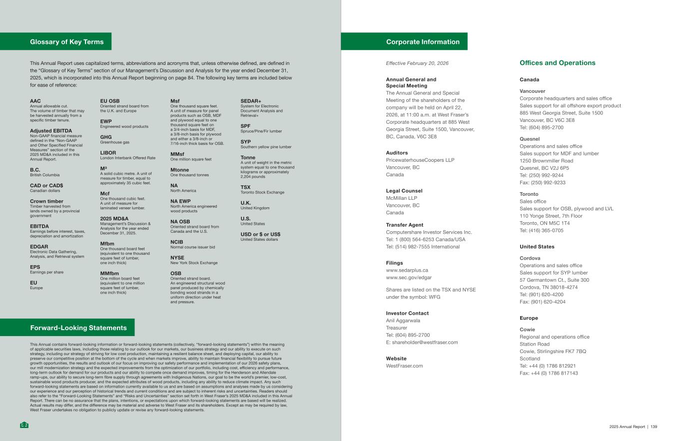 2025 Annual Report | 139 Glossary of Key Terms This Annual Report uses capitalized terms, abbreviations and acronyms that, unless otherwise defined, are defined in the “Glossary of Key Terms” section of our Management’s Discussion and Analysis for the year ended December 31, 2025, which is incorporated into this Annual Report beginning on page 84. The following key terms are included below for ease of reference: AAC Annual allowable cut. The volume of timber that may be harvested annually from a specific timber tenure. Adjusted EBITDA Non-GAAP financial measure defined in the “Non-GAAP and Other Specified Financial Measures” section of the 2025 MD&A included in this Annual Report. B.C. British Columbia CAD or CAD$ Canadian dollars Crown timber Timber harvested from lands owned by a provincial government EBITDA Earnings before interest, taxes, depreciation and amortization EDGAR Electronic Data Gathering, Analysis, and Retrieval system EPS Earnings per share EU Europe EU OSB Oriented strand board from the U.K. and Europe EWP Engineered wood products GHG Greenhouse gas LIBOR London Interbank Offered Rate M³ A solid cubic metre. A unit of measure for timber, equal to approximately 35 cubic feet. Mcf One thousand cubic feet. A unit of measure for laminated veneer lumber. 2025 MD&A Management’s Discussion & Analysis for the year ended December 31, 2025. Mfbm One thousand board feet (equivalent to one thousand square feet of lumber, one inch thick) MMfbm One million board feet (equivalent to one million square feet of lumber, one inch thick) Msf One thousand square feet. A unit of measure for panel products such as OSB, MDF and plywood equal to one thousand square feet on a 3/4‑inch basis for MDF, a 3/8‑inch basis for plywood and either a 3/8‑inch or 7/16‑inch thick basis for OSB. MMsf One million square feet Mtonne One thousand tonnes NA North America NA EWP North America engineered wood products NA OSB Oriented strand board from Canada and the U.S. NCIB Normal course issuer bid NYSE New York Stock Exchange OSB Oriented strand board. An engineered structural wood panel produced by chemically bonding wood strands in a uniform direction under heat and pressure. SEDAR+ System for Electronic Document Analysis and Retrieval+ SPF Spruce/Pine/Fir lumber SYP Southern yellow pine lumber Tonne A unit of weight in the metric system equal to one thousand kilograms or approximately 2,204 pounds TSX Toronto Stock Exchange U.K. United Kingdom U.S. United States USD or $ or US$ United States dollars This Annual contains forward-looking information or forward-looking statements (collectively, “forward-looking statements”) within the meaning of applicable securities laws, including those relating to our outlook for our markets, our business strategy and our ability to execute on such strategy, including our strategy of striving for low cost production, maintaining a resilient balance sheet, and deploying capital, our ability to preserve our competitive position at the bottom of the cycle and when markets improve, ability to maintain financial flexibility to pursue future growth opportunities, the results and outlook of our focus on improving our safety performance and implementation of our 2026 safety plans, our mill modernization strategy and the expected improvements from the optimization of our portfolio, including cost, efficiency and performance, long‑term outlook for demand for our products and our ability to compete once demand improves, timing for the Henderson and Allendale ramp‑ups, our ability to secure long‑term fibre supply through agreements with Indigenous Nations, our goal to be the world’s premier, low‑cost, sustainable wood products producer, and the expected attributes of wood products, including any ability to reduce climate impact. Any such forward‑looking statements are based on information currently available to us and are based on assumptions and analyses made by us considering our experience and our perception of historical trends and current conditions and are subject to inherent risks and uncertainties. Readers should also refer to the “Forward-Looking Statements” and “Risks and Uncertainties” section set forth in West Fraser’s 2025 MD&A included in this Annual Report. There can be no assurance that the plans, intentions, or expectations upon which forward-looking statements are based will be realized. Actual results may differ, and the difference may be material and adverse to West Fraser and its shareholders. Except as may be required by law, West Fraser undertakes no obligation to publicly update or revise any forward-looking statements. Corporate Information Effective February 20, 2026 Annual General and Special Meeting The Annual General and Special Meeting of the shareholders of the company will be held on April 22, 2026, at 11:00 a.m. at West Fraser’s Corporate headquarters at 885 West Georgia Street, Suite 1500, Vancouver, BC, Canada, V6C 3E8 Auditors PricewaterhouseCoopers LLP Vancouver, BC Canada Legal Counsel McMillan LLP Vancouver, BC Canada Transfer Agent Computershare Investor Services Inc. Tel: 1 (800) 564-6253 Canada/USA Tel: (514) 982-7555 International Filings www.sedarplus.ca www.sec.gov/edgar Shares are listed on the TSX and NYSE under the symbol: WFG Investor Contact Anil Aggarwala Treasurer Tel: (604) 895-2700 E: shareholder@westfraser.com Website WestFraser.com Offices and Operations Canada Vancouver Corporate headquarters and sales office Sales support for all offshore export product 885 West Georgia Street, Suite 1500 Vancouver, BC V6C 3E8 Tel: (604) 895-2700 Quesnel Operations and sales office Sales support for MDF and lumber 1250 Brownmiller Road Quesnel, BC V2J 6P5 Tel: (250) 992-9244 Fax: (250) 992-9233 Toronto Sales office Sales support for OSB, plywood and LVL 110 Yonge Street, 7th Floor Toronto, ON M5C 1T4 Tel: (416) 365-0705 United States Cordova Operations and sales office Sales support for SYP lumber 