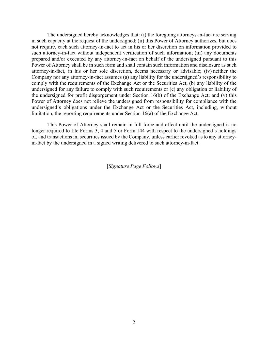 2 The undersigned hereby acknowledges that: (i) the foregoing attorneys-in-fact are serving in such capacity at the request of the undersigned; (ii) this Power of Attorney authorizes, but does not require, each such attorney-in-fact to act in his or her discretion on information provided to such attorney-in-fact without independent verification of such information; (iii) any documents prepared and/or executed by any attorney-in-fact on behalf of the undersigned pursuant to this Power of Attorney shall be in such form and shall contain such information and disclosure as such attorney-in-fact, in his or her sole discretion, deems necessary or advisable; (iv) neither the Company nor any attorney-in-fact assumes (a) any liability for the undersigned’s responsibility to comply with the requirements of the Exchange Act or the Securities Act, (b) any liability of the undersigned for any failure to comply with such requirements or (c) any obligation or liability of the undersigned for profit disgorgement under Section 16(b) of the Exchange Act; and (v) this Power of Attorney does not relieve the undersigned from responsibility for compliance with the undersigned’s obligations under the Exchange Act or the Securities Act, including, without limitation, the reporting requirements under Section 16(a) of the Exchange Act. This Power of Attorney shall remain in full force and effect until the undersigned is no longer required to file Forms 3, 4 and 5 or Form 144 with respect to the undersigned’s holdings of, and transactions in, securities issued by the Company, unless earlier revoked as to any attorney- in-fact by the undersigned in a signed writing delivered to such attorney-in-fact. [Signature Page Follows]