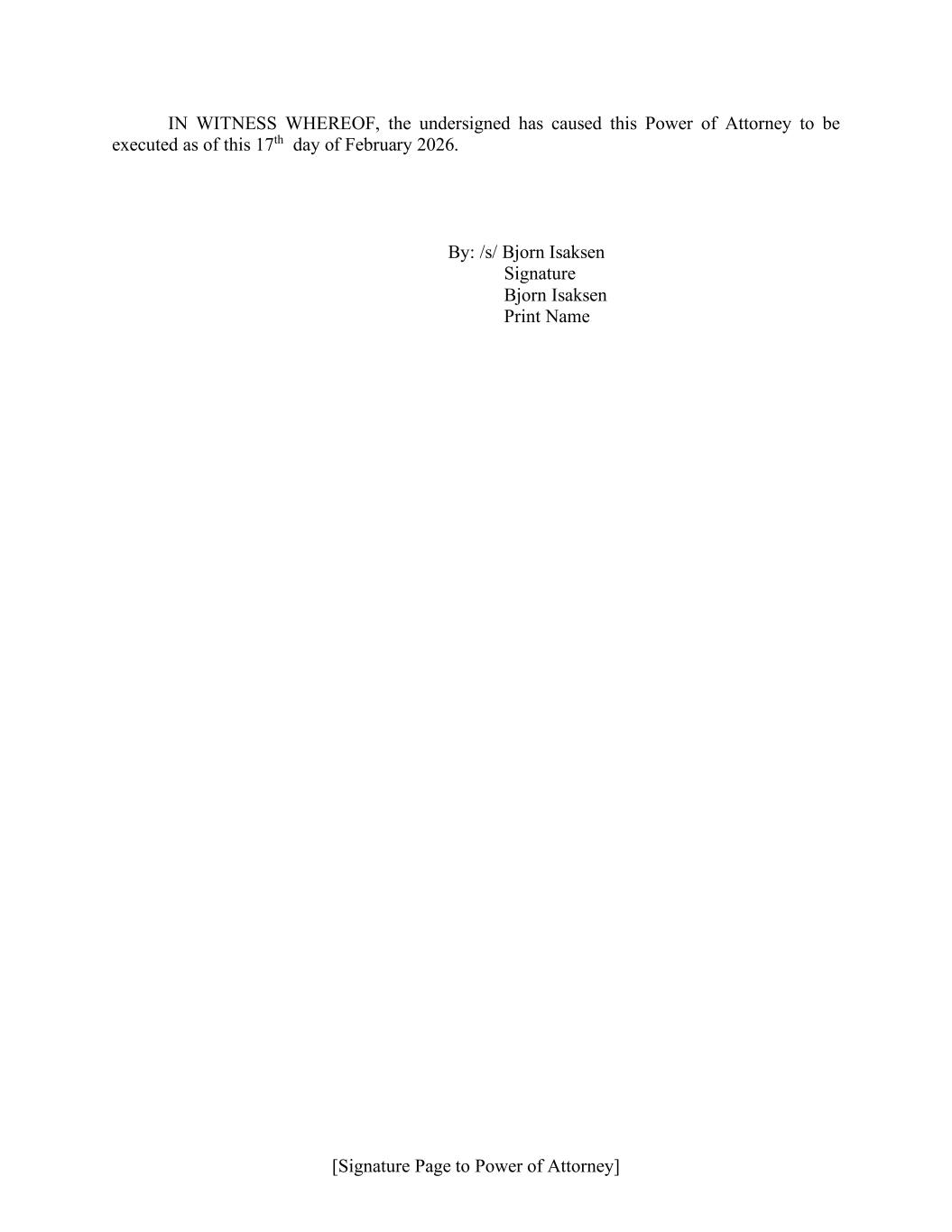 [Signature Page to Power of Attorney] IN WITNESS WHEREOF, the undersigned has caused this Power of Attorney to be executed as of this 17th day of February 2026. By: /s/ Bjorn Isaksen Signature Bjorn Isaksen Print Name