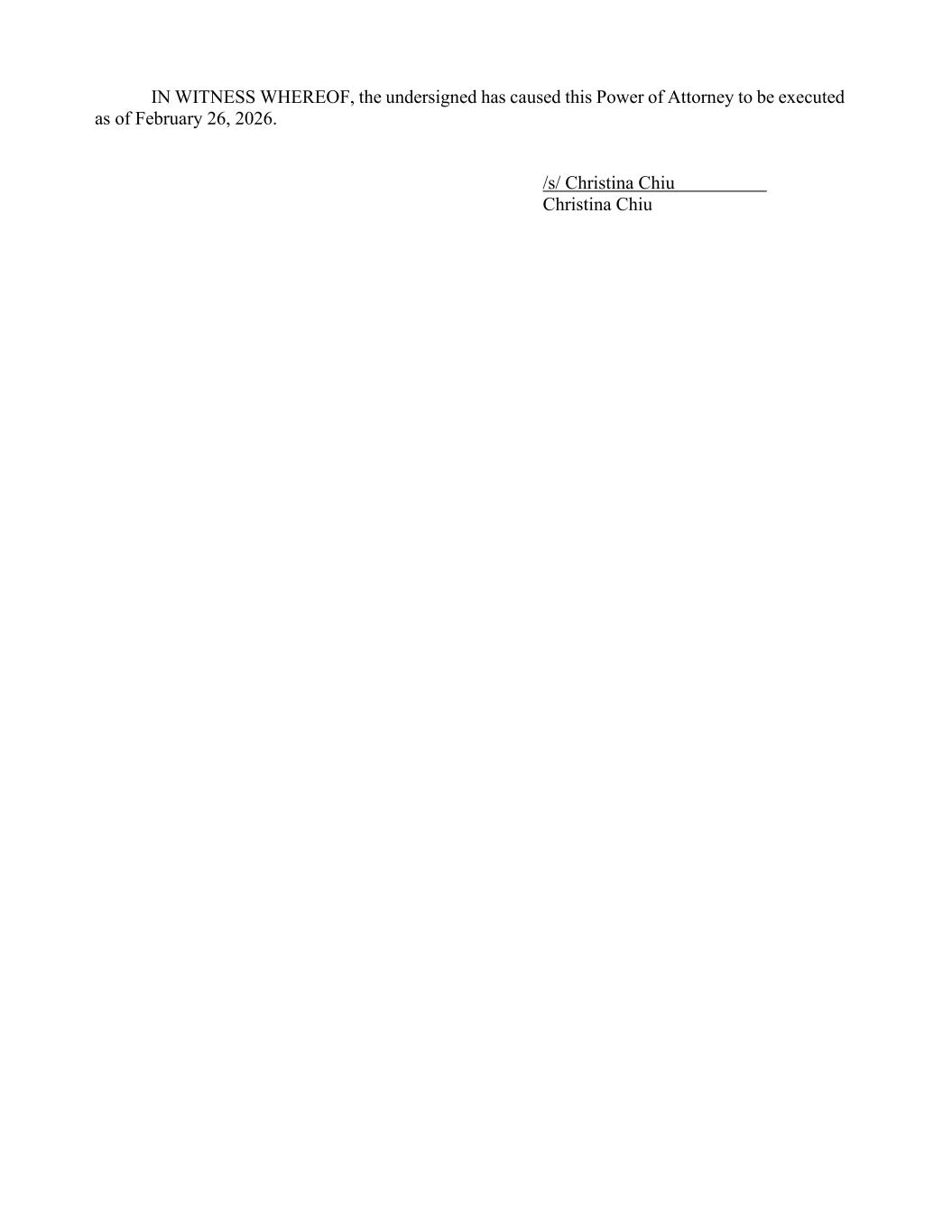 IN WITNESS WHEREOF, the undersigned has caused this Power of Attorney to be executed as of February 26, 2026. /s/ Christina Chiu Christina Chiu