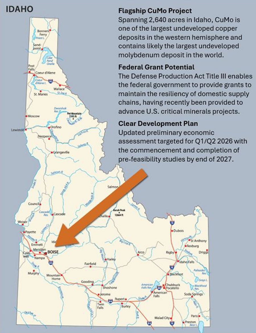 Idaho Copper Corporation is a mineral exploration and development company, focused on exploring and developing a large copper-molybdenum-silver deposit in Idaho (United States), (the “CuMo” Project”).