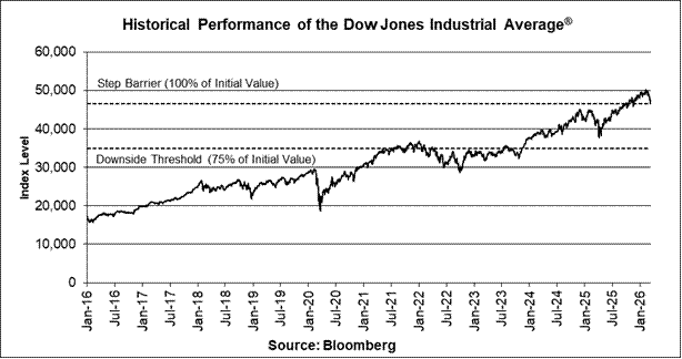 The graph below illustrates the daily performance of the Dow Jones Industrial Average® from January 4, 2016 through March 13, 2026, based on information from Bloomberg, without independent verification. The closing level of the Dow Jones Industrial Average® on March 13, 2026 was 46,558.47. We obtained the closing levels of the Dow Jones Industrial Average® above and below from Bloomberg, without independent verification.