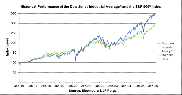 The graph below illustrates the daily performance of the Dow Jones Industrial Average® and the S&P 500® Index from January 4, 2016 through March 13, 2026. For comparison purposes, each Underlying has been normalized to have a closing level of 100.00 on January 4, 2016 by dividing the closing level of that Underlying on each day by the closing level of that Underlying on January 4, 2016 and multiplying by 100.00. We obtained the closing levels used to determine the normalized closing levels set forth below from Bloomberg, without independent verification.