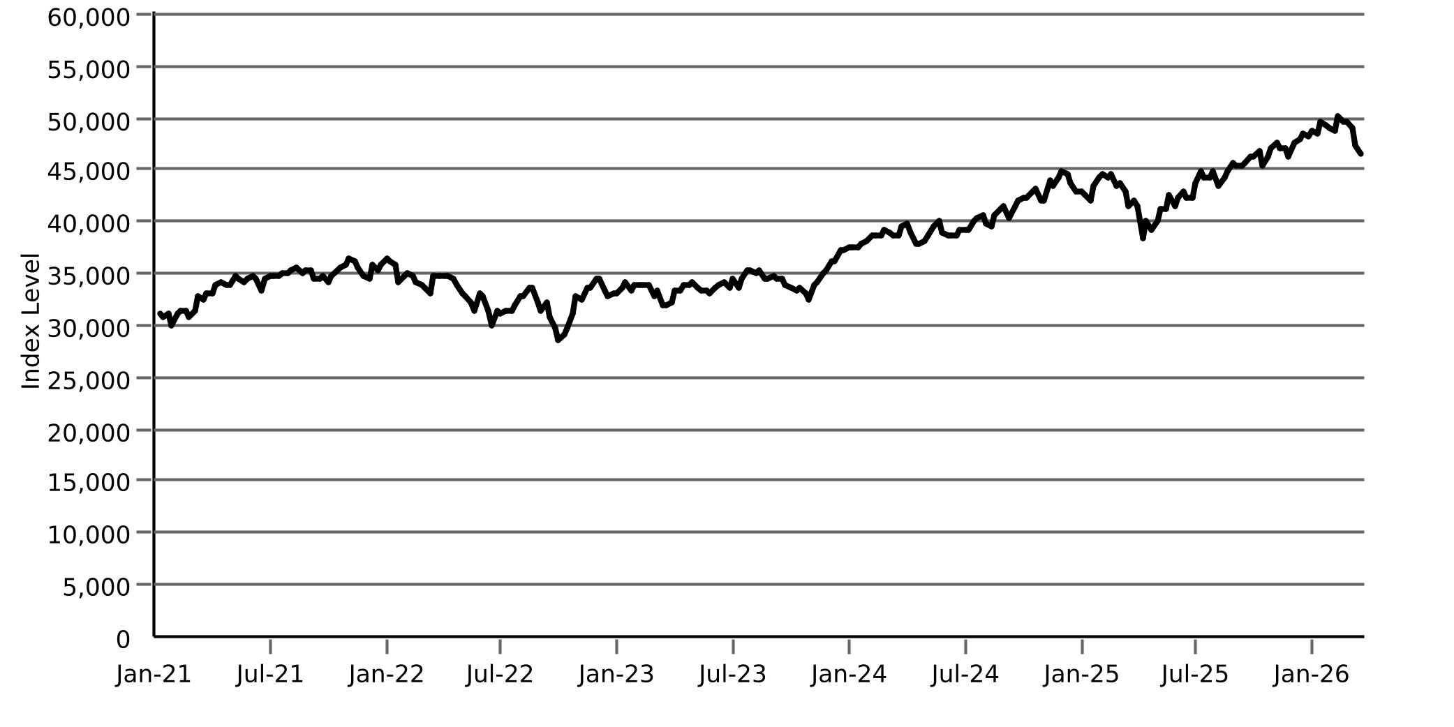 The following graphs set forth the historical performance of each Index based on the weekly historical closing levels from January 8, 2021 through March 13, 2026. The closing level of the Dow Jones Industrial Average® on March 13, 2026 was 46,558.47. The closing level of the Russell 2000® Index on March 13, 2026 was 2,480.051. The closing level of the S&P 500® Index on March 13, 2026 was 6,632.19. We obtained the closing levels above and below from the Bloomberg Professional® service (“Bloomberg”), without independent verification.