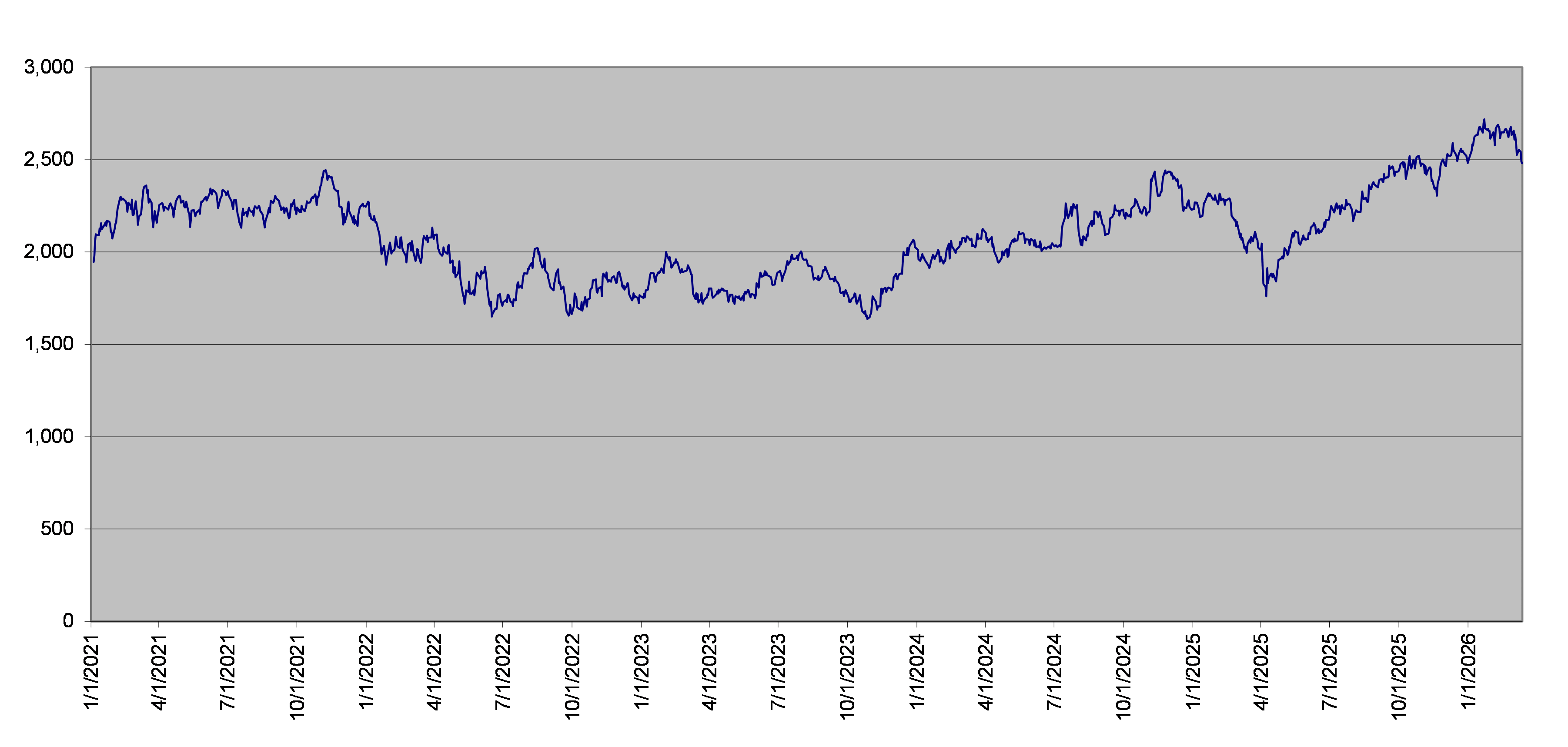 RTY Index Daily Closing Levels January 1, 2021 to March 13, 2026 |