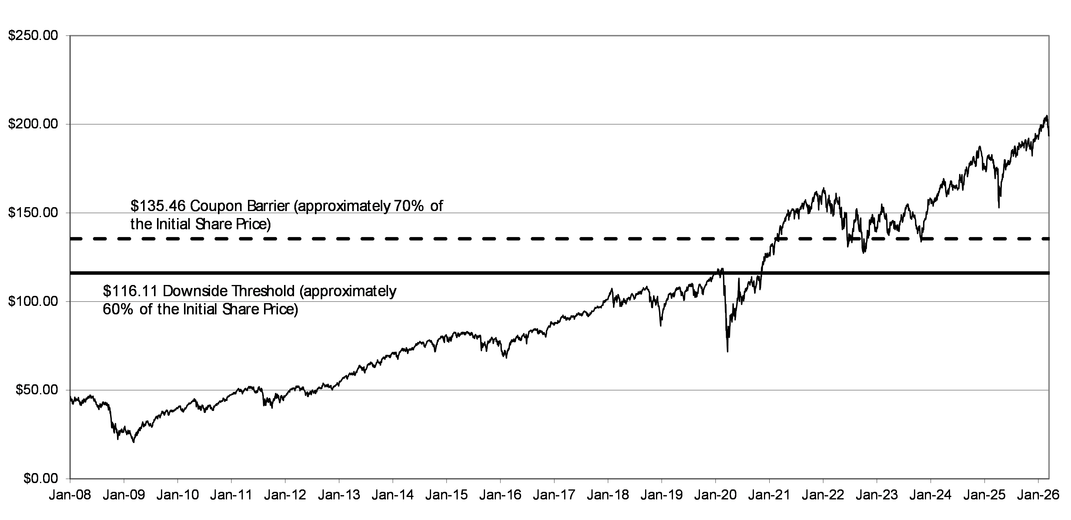 The graph below illustrates the daily performance of the Invesco S&P 500® Equal Weight ETF and the Invesco QQQ TrustSM, Series 1 from January 1, 2008 through March 11, 2026. For comparison purposes, each of the Underlying Shares has been “normalized” to have a closing price of $100 on January 1, 2008 by dividing the closing price of such Underlying Shares on each Trading Day by the closing price of such Underlying Shares on January 1, 2008 and multiplying by 100. We obtained the closing price used to determine the normalized closing price set forth below from Bloomberg, without independent verification.