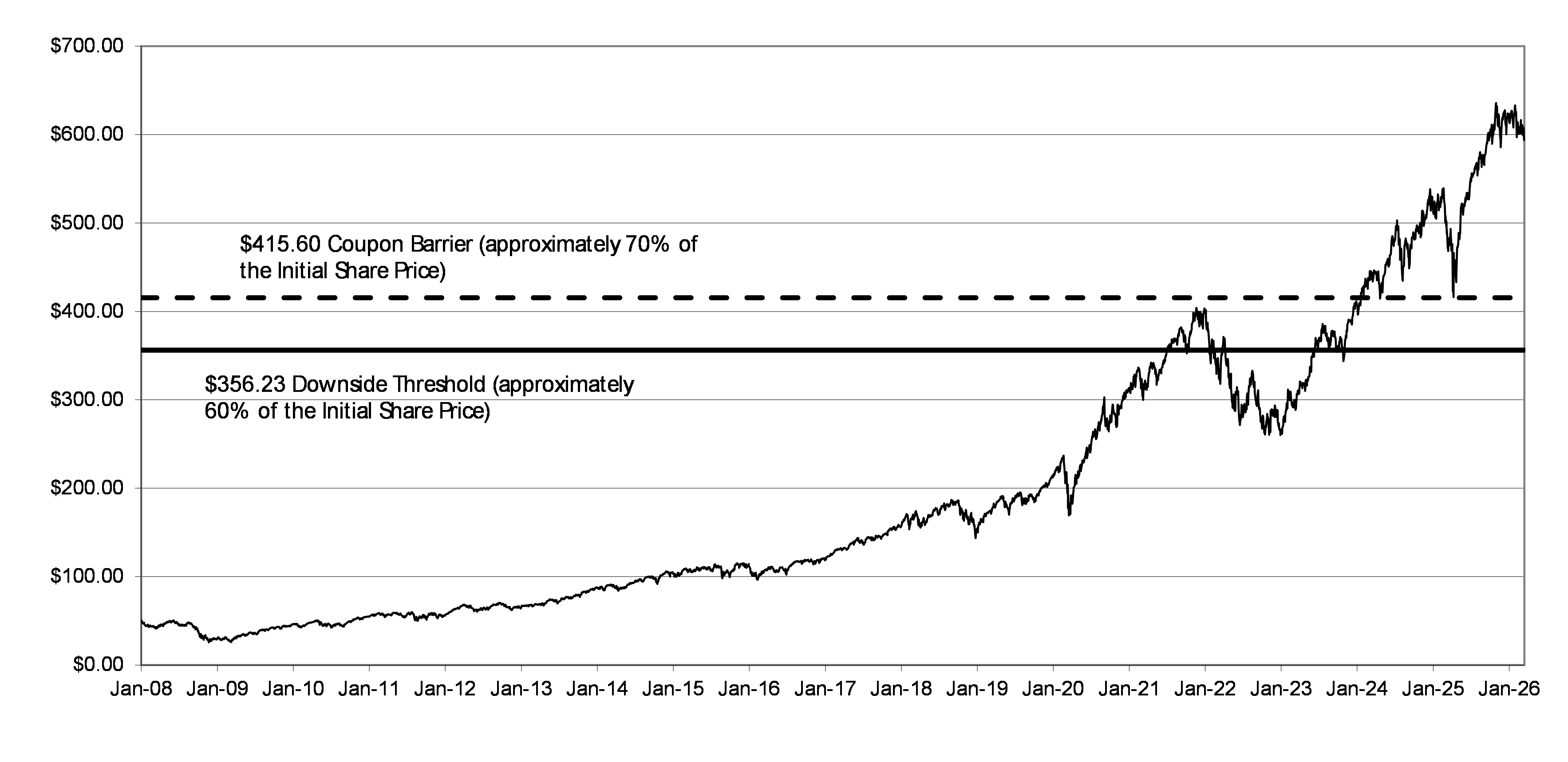 * The dashed line indicates the Coupon Barrier of $415.60, which is approximately 70% of its Initial Underlying Price.