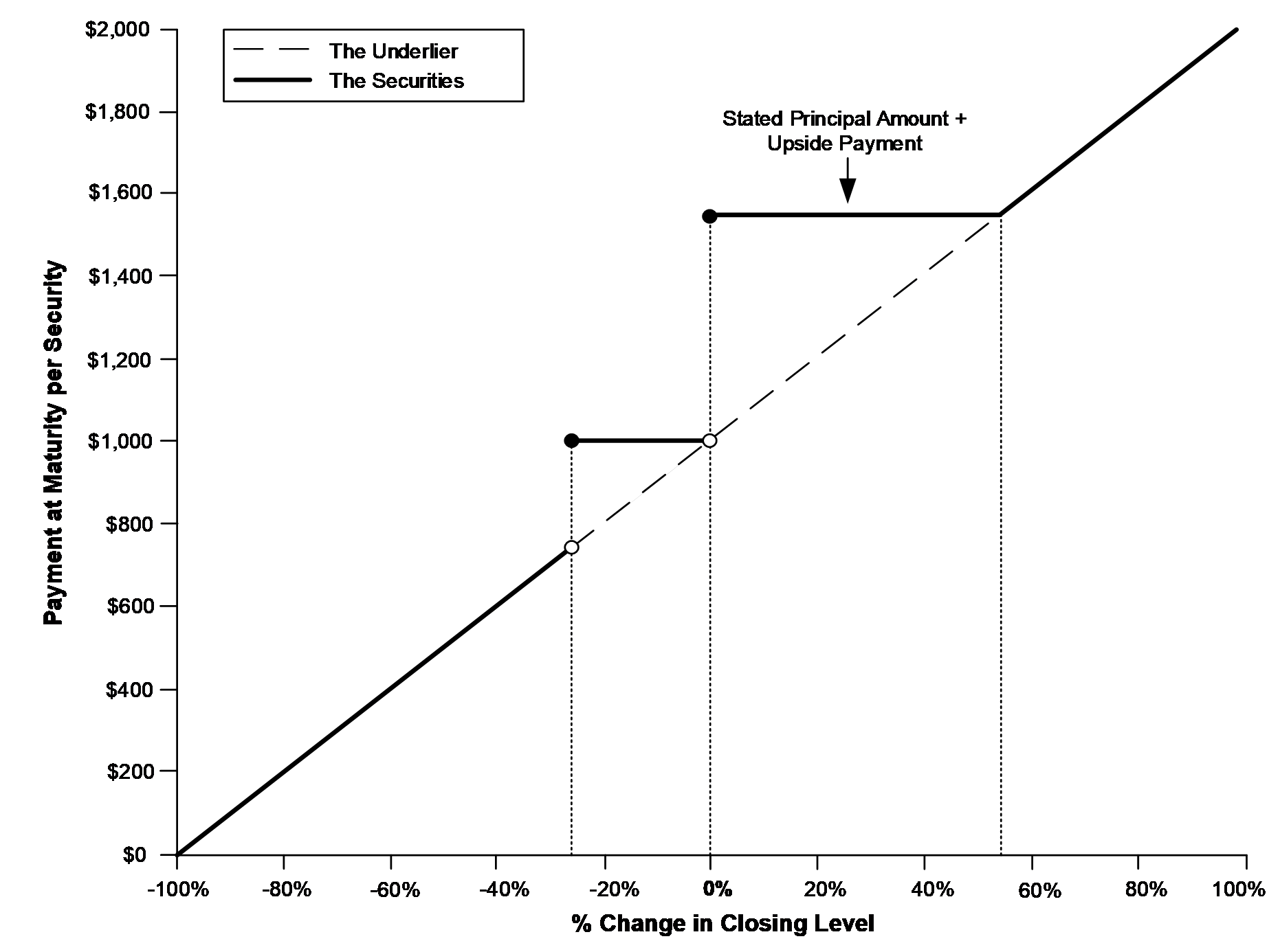 ■Upside Scenario. If the final level is greater than or equal to the initial level, investors will receive the stated principal amount plus the greater of (i) the stated principal amount multiplied by the underlier percent change and (ii) the upside payment per security.