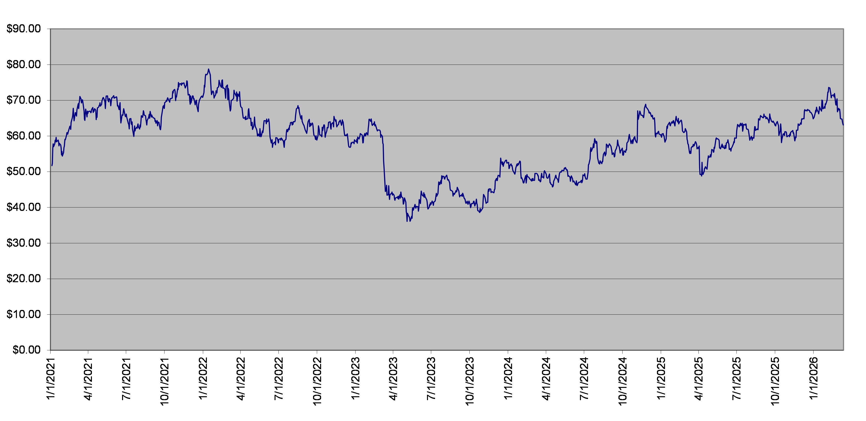 The closing level of the underlier on March 13, 2026 was $63.11. The following graph sets forth the daily closing levels of the underlier for the period noted below. We obtained the historical information presented in this document from Bloomberg Financial Markets, without independent verification. The underlier has at times experienced periods of high volatility. You should not take the historical closing levels of the underlier as an indication of its future performance, and no assurance can be given as to the closing level of the underlier at any time.