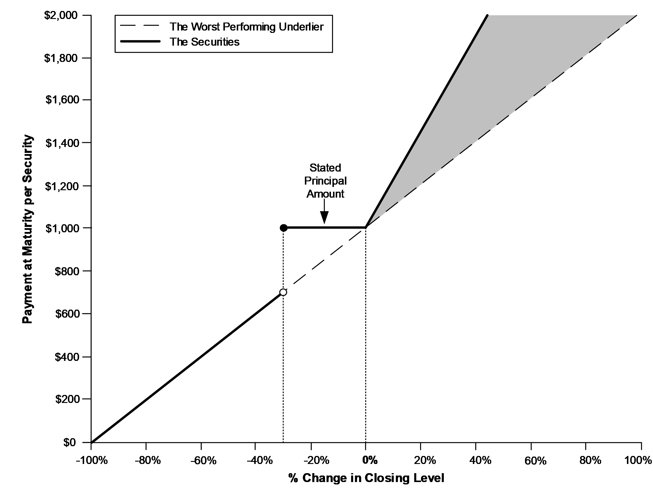 ■Payment at maturity. At maturity, if the final level of each underlier is greater than its initial level, investors will receive the stated principal amount plus the leveraged upside payment. If the final level of any underlier is equal to or less than its initial level but the final level of each underlier is greater than or equal to its downside threshold level, investors will receive only the stated principal amount at maturity. If, however, the final level of any underlier is less than its downside threshold level, investors will lose 1% for every 1% decline in the level of the worst performing underlier over the term of the securities. Under these circumstances, the payment at maturity will be significantly less than the stated principal amount and could be zero.