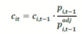 = correction factor for stock (i) on the previous day (t-1). This is set to 1 at the start of the calculation period (usually 20 trading days before the review cutoff date). |