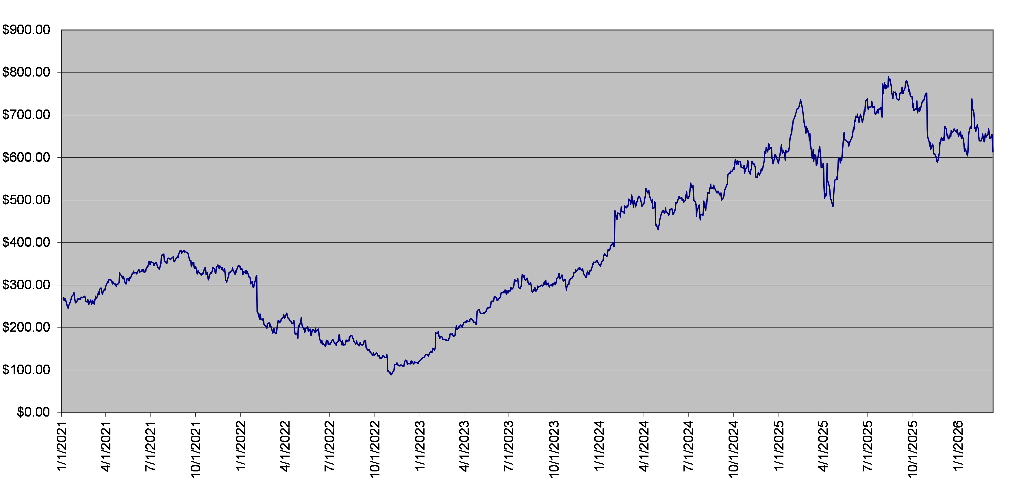 META Stock Daily Closing Levels January 1, 2021 to March 13, 2026 |