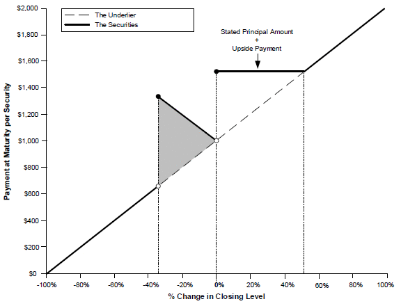 ■Payment at maturity. At maturity, if the final level is greater than or equal to the initial level, investors will receive the stated principal amount plus the greater of (i) an amount in cash based on the underlier percent change and (ii) the upside payment specified herein. If the final level is less than the initial level but is greater than or equal to the downside threshold level, investors will receive at maturity the stated principal amount plus a positive return equal to (i) the absolute value of the percentage decline in the level of the underlier multiplied by (ii) the absolute return participation rate. If, however, the final level is less than the downside threshold level, investors will lose 1% for every 1% decline in the level of the underlier over the term of the securities. Under these circumstances, the payment at maturity will be significantly less than the stated principal amount and could be zero.