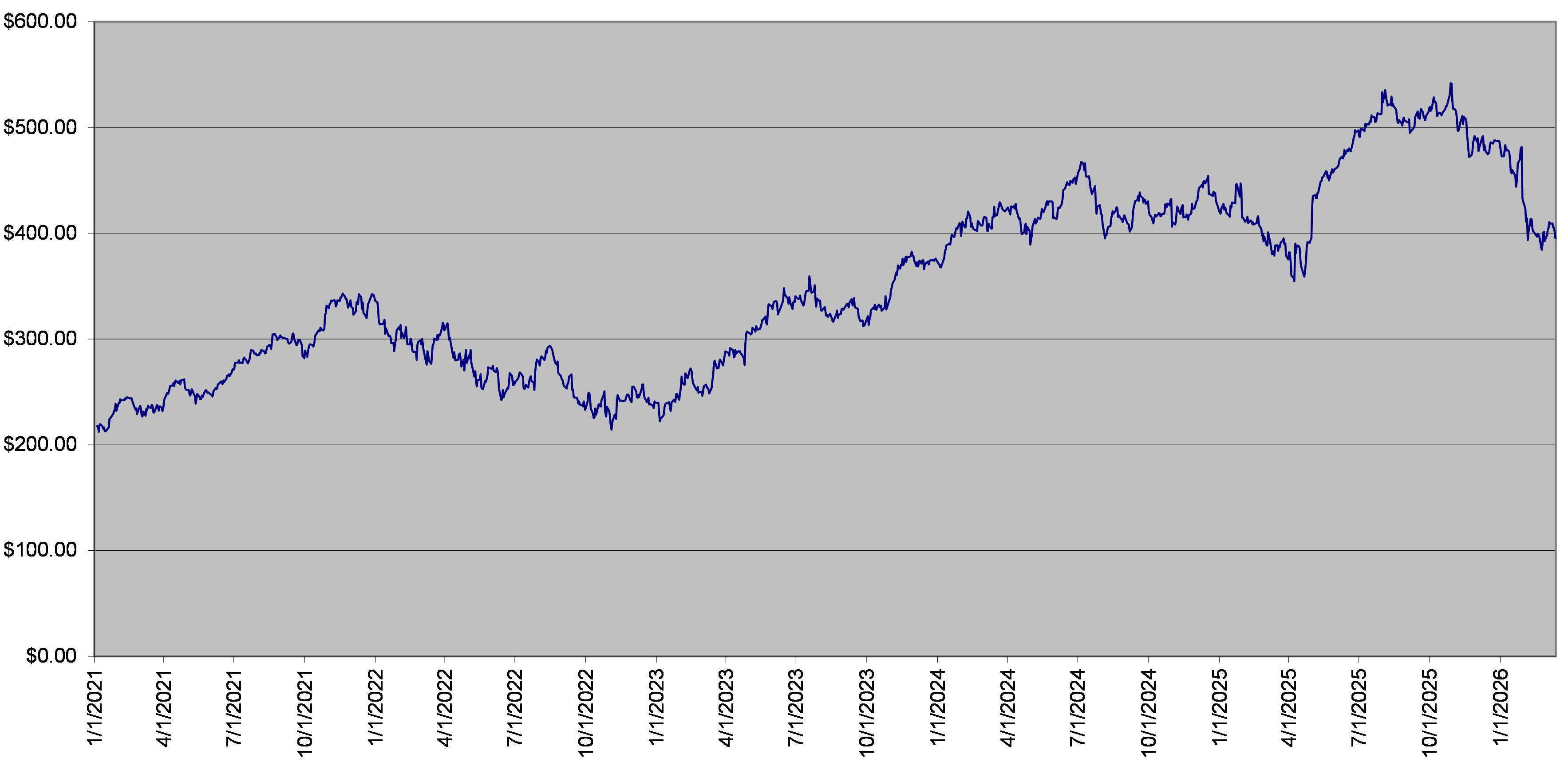 The closing level of the underlier on March 13, 2026 was $395.55. The following graph sets forth the daily closing levels of the underlier for the period noted below. We obtained the historical information presented in this document from Bloomberg Financial Markets, without independent verification. The underlier has at times experienced periods of high volatility. You should not take the historical closing levels of the underlier as an indication of its future performance, and no assurance can be given as to the closing level of the underlier at any time.