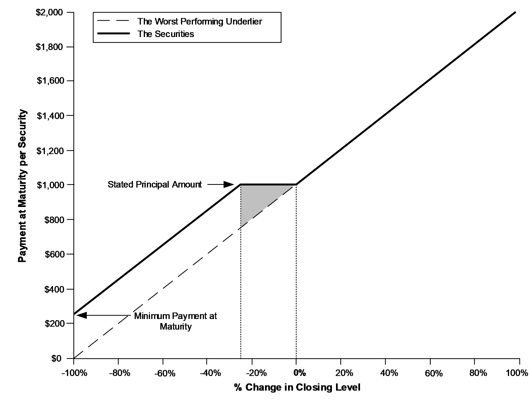 ■Upside Scenario. If the final level of the worst performing underlier is greater than its initial level, investors will receive the stated principal amount plus 100% of the appreciation of the worst performing underlier over the term of the securities.
