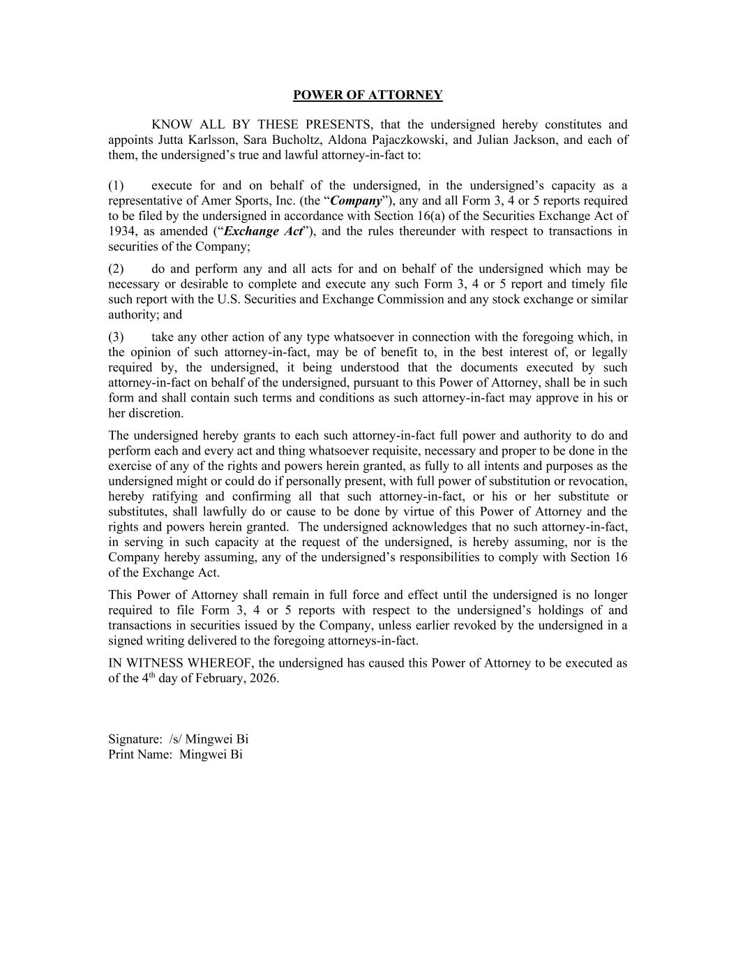 POWER OF ATTORNEY KNOW ALL BY THESE PRESENTS, that the undersigned hereby constitutes and appoints Jutta Karlsson, Sara Bucholtz, Aldona Pajaczkowski, and Julian Jackson, and each of them, the undersigned’s true and lawful attorney-in-fact to: (1) execute for and on behalf of the undersigned, in the undersigned’s capacity as a representative of Amer Sports, Inc. (the “Company”), any and all Form 3, 4 or 5 reports required to be filed by the undersigned in accordance with Section 16(a) of the Securities Exchange Act of 1934, as amended (“Exchange Act”), and the rules thereunder with respect to transactions in securities of the Company; (2) do and perform any and all acts for and on behalf of the undersigned which may be necessary or desirable to complete and execute any such Form 3, 4 or 5 report and timely file such report with the U.S. Securities and Exchange Commission and any stock exchange or similar authority; and (3) take any other action of any type whatsoever in connection with the foregoing which, in the opinion of such attorney-in-fact, may be of benefit to, in the best interest of, or legally required by, the undersigned, it being understood that the documents executed by such attorney-in-fact on behalf of the undersigned, pursuant to this Power of Attorney, shall be in such form and shall contain such terms and conditions as such attorney-in-fact may approve in his or her discretion. The undersigned hereby grants to each such attorney-in-fact full power and authority to do and perform each and every act and thing whatsoever requisite, necessary and proper to be done in the exercise of any of the rights and powers herein granted, as fully to all intents and purposes as the undersigned might or could do if personally present, with full power of substitution or revocation, hereby ratifying and confirming all that such attorney-in-fact, or his or her substitute or substitutes, shall lawfully do or cause to be done by virtue of this Power of Attorney and the rights and powers herein granted. The undersigned acknowledges that no such attorney-in-fact, in serving in such capacity at the request of the undersigned, is hereby assuming, nor is the Company hereby assuming, any of the undersigned’s responsibilities to comply with Section 16 of the Exchange Act. This Power of Attorney shall remain in full force and effect until the undersigned is no longer required to file Form 3, 4 or 5 reports with respect to the undersigned’s holdings of and transactions in securities issued by the Company, unless earlier revoked by the undersigned in a signed writing delivered to the foregoing attorneys-in-fact. IN WITNESS WHEREOF, the undersigned has caused this Power of Attorney to be executed as of the 4th day of February, 2026. Signature: /s/ Mingwei Bi Print Name: Mingwei Bi