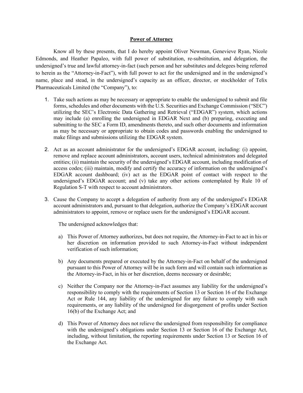 Power of Attorney Know all by these presents, that I do hereby appoint Oliver Newman, Genevieve Ryan, Nicole Edmonds, and Heather Papaleo, with full power of substitution, re-substitution, and delegation, the undersigned’s true and lawful attorney-in-fact (such person and her substitutes and delegees being referred to herein as the “Attorney-in-Fact”), with full power to act for the undersigned and in the undersigned’s name, place and stead, in the undersigned’s capacity as an officer, director, or stockholder of Telix Pharmaceuticals Limited (the “Company”), to: 1. Take such actions as may be necessary or appropriate to enable the undersigned to submit and file forms, schedules and other documents with the U.S. Securities and Exchange Commission (“SEC”) utilizing the SEC’s Electronic Data Gathering and Retrieval (“EDGAR”) system, which actions may include (a) enrolling the undersigned in EDGAR Next and (b) preparing, executing and submitting to the SEC a Form ID, amendments thereto, and such other documents and information as may be necessary or appropriate to obtain codes and passwords enabling the undersigned to make filings and submissions utilizing the EDGAR system. 2. Act as an account administrator for the undersigned’s EDGAR account, including: (i) appoint, remove and replace account administrators, account users, technical administrators and delegated entities; (ii) maintain the security of the undersigned’s EDGAR account, including modification of access codes; (iii) maintain, modify and certify the accuracy of information on the undersigned’s EDGAR account dashboard; (iv) act as the EDGAR point of contact with respect to the undersigned’s EDGAR account; and (v) take any other actions contemplated by Rule 10 of Regulation S-T with respect to account administrators. 3. Cause the Company to accept a delegation of authority from any of the undersigned’s EDGAR account administrators and, pursuant to that delegation, authorize the Company’s EDGAR account administrators to appoint, remove or replace users for the undersigned’s EDGAR account. The undersigned acknowledges that: a) This Power of Attorney authorizes, but does not require, the Attorney-in-Fact to act in his or her discretion on information provided to such Attorney-in-Fact without independent verification of such information; b) Any documents prepared or executed by the Attorney-in-Fact on behalf of the undersigned pursuant to this Power of Attorney will be in such form and will contain such information as the Attorney-in-Fact, in his or her discretion, deems necessary or desirable; c) Neither the Company nor the Attorney-in-Fact assumes any liability for the undersigned’s responsibility to comply with the requirements of Section 13 or Section 16 of the Exchange Act or Rule 144, any liability of the undersigned for any failure to comply with such requirements, or any liability of the undersigned for disgorgement of profits under Section 16(b) of the Exchange Act; and d) This Power of Attorney does not relieve the undersigned from responsibility for compliance with the undersigned’s obligations under Section 13 or Section 16 of the Exchange Act, including, without limitation, the reporting requirements under Section 13 or Section 16 of the Exchange Act.