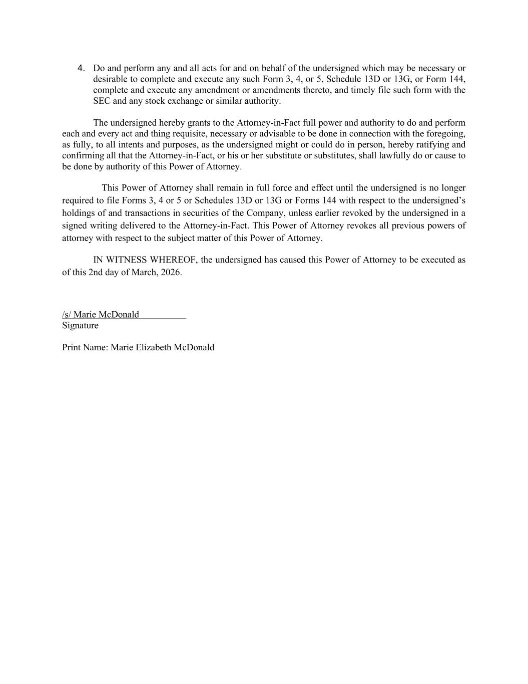 4. Do and perform any and all acts for and on behalf of the undersigned which may be necessary or desirable to complete and execute any such Form 3, 4, or 5, Schedule 13D or 13G, or Form 144, complete and execute any amendment or amendments thereto, and timely file such form with the SEC and any stock exchange or similar authority. The undersigned hereby grants to the Attorney-in-Fact full power and authority to do and perform each and every act and thing requisite, necessary or advisable to be done in connection with the foregoing, as fully, to all intents and purposes, as the undersigned might or could do in person, hereby ratifying and confirming all that the Attorney-in-Fact, or his or her substitute or substitutes, shall lawfully do or cause to be done by authority of this Power of Attorney. This Power of Attorney shall remain in full force and effect until the undersigned is no longer required to file Forms 3, 4 or 5 or Schedules 13D or 13G or Forms 144 with respect to the undersigned’s holdings of and transactions in securities of the Company, unless earlier revoked by the undersigned in a signed writing delivered to the Attorney-in-Fact. This Power of Attorney revokes all previous powers of attorney with respect to the subject matter of this Power of Attorney. IN WITNESS WHEREOF, the undersigned has caused this Power of Attorney to be executed as of this 2nd day of March, 2026. /s/ Marie McDonald Signature Print Name: Marie Elizabeth McDonald