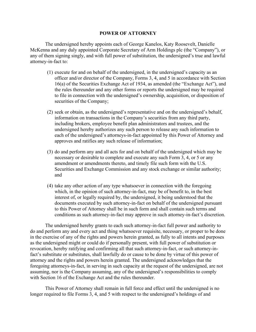 POWER OF ATTORNEY The undersigned hereby appoints each of George Kanelos, Katy Roosevelt, Danielle McKenna and any duly appointed Corporate Secretary of Arm Holdings plc (the “Company”), or any of them signing singly, and with full power of substitution, the undersigned’s true and lawful attorney-in-fact to: (1) execute for and on behalf of the undersigned, in the undersigned’s capacity as an officer and/or director of the Company, Forms 3, 4, and 5 in accordance with Section 16(a) of the Securities Exchange Act of 1934, as amended (the “Exchange Act”), and the rules thereunder and any other forms or reports the undersigned may be required to file in connection with the undersigned’s ownership, acquisition, or disposition of securities of the Company; (2) seek or obtain, as the undersigned’s representative and on the undersigned’s behalf, information on transactions in the Company’s securities from any third party, including brokers, employee benefit plan administrators and trustees, and the undersigned hereby authorizes any such person to release any such information to each of the undersigned’s attorneys-in-fact appointed by this Power of Attorney and approves and ratifies any such release of information; (3) do and perform any and all acts for and on behalf of the undersigned which may be necessary or desirable to complete and execute any such Form 3, 4, or 5 or any amendment or amendments thereto, and timely file such form with the U.S. Securities and Exchange Commission and any stock exchange or similar authority; and (4) take any other action of any type whatsoever in connection with the foregoing which, in the opinion of such attorney-in-fact, may be of benefit to, in the best interest of, or legally required by, the undersigned, it being understood that the documents executed by such attorney-in-fact on behalf of the undersigned pursuant to this Power of Attorney shall be in such form and shall contain such terms and conditions as such attorney-in-fact may approve in such attorney-in-fact’s discretion. The undersigned hereby grants to each such attorney-in-fact full power and authority to do and perform any and every act and thing whatsoever requisite, necessary, or proper to be done in the exercise of any of the rights and powers herein granted, as fully to all intents and purposes as the undersigned might or could do if personally present, with full power of substitution or revocation, hereby ratifying and confirming all that such attorney-in-fact, or such attorney-in- fact’s substitute or substitutes, shall lawfully do or cause to be done by virtue of this power of attorney and the rights and powers herein granted. The undersigned acknowledges that the foregoing attorneys-in-fact, in serving in such capacity at the request of the undersigned, are not assuming, nor is the Company assuming, any of the undersigned’s responsibilities to comply with Section 16 of the Exchange Act and the rules thereunder. This Power of Attorney shall remain in full force and effect until the undersigned is no longer required to file Forms 3, 4, and 5 with respect to the undersigned’s holdings of and