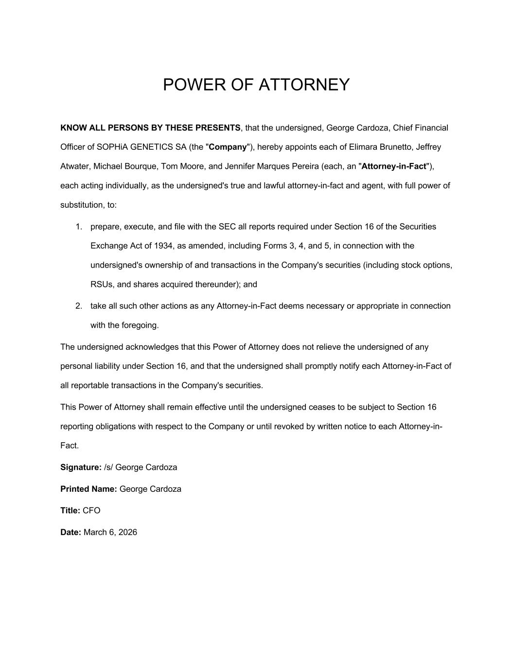 POWER OF ATTORNEY KNOW ALL PERSONS BY THESE PRESENTS, that the undersigned, George Cardoza, Chief Financial Officer of SOPHiA GENETICS SA (the "Company"), hereby appoints each of Elimara Brunetto, Jeffrey Atwater, Michael Bourque, Tom Moore, and Jennifer Marques Pereira (each, an "Attorney-in-Fact"), each acting individually, as the undersigned's true and lawful attorney-in-fact and agent, with full power of substitution, to: 1. prepare, execute, and file with the SEC all reports required under Section 16 of the Securities Exchange Act of 1934, as amended, including Forms 3, 4, and 5, in connection with the undersigned's ownership of and transactions in the Company's securities (including stock options, RSUs, and shares acquired thereunder); and 2. take all such other actions as any Attorney-in-Fact deems necessary or appropriate in connection with the foregoing. The undersigned acknowledges that this Power of Attorney does not relieve the undersigned of any personal liability under Section 16, and that the undersigned shall promptly notify each Attorney-in-Fact of all reportable transactions in the Company's securities. This Power of Attorney shall remain effective until the undersigned ceases to be subject to Section 16 reporting obligations with respect to the Company or until revoked by written notice to each Attorney-in- Fact. Signature: /s/ George Cardoza Printed Name: George Cardoza Title: CFO Date: March 6, 2026