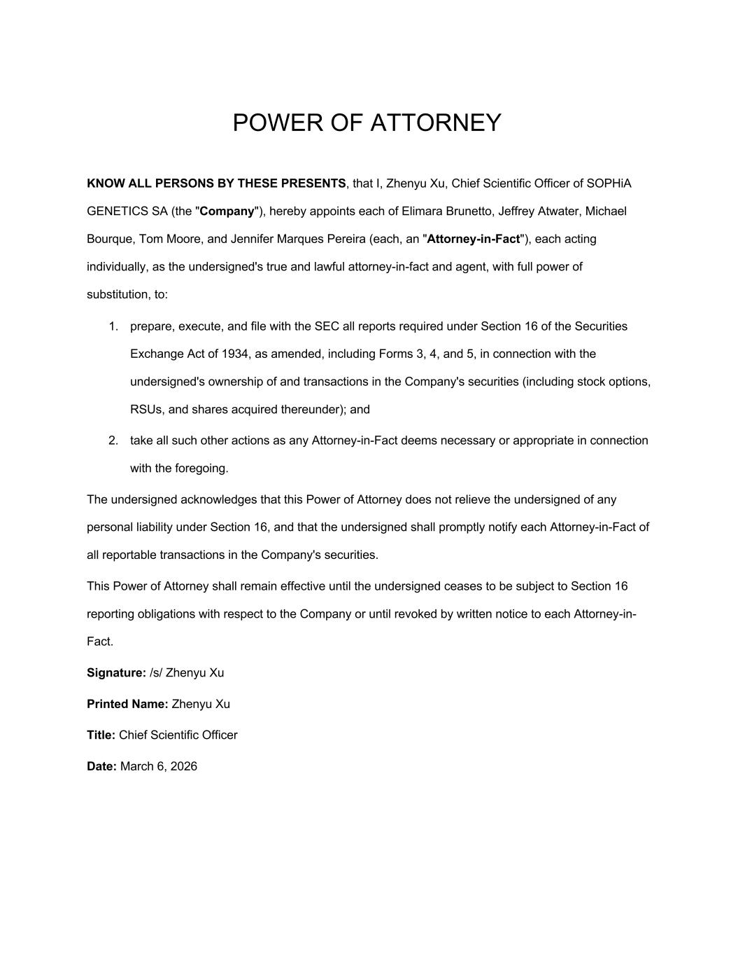 POWER OF ATTORNEY KNOW ALL PERSONS BY THESE PRESENTS, that I, Zhenyu Xu, Chief Scientific Officer of SOPHiA GENETICS SA (the "Company"), hereby appoints each of Elimara Brunetto, Jeffrey Atwater, Michael Bourque, Tom Moore, and Jennifer Marques Pereira (each, an "Attorney-in-Fact"), each acting individually, as the undersigned's true and lawful attorney-in-fact and agent, with full power of substitution, to: 1. prepare, execute, and file with the SEC all reports required under Section 16 of the Securities Exchange Act of 1934, as amended, including Forms 3, 4, and 5, in connection with the undersigned's ownership of and transactions in the Company's securities (including stock options, RSUs, and shares acquired thereunder); and 2. take all such other actions as any Attorney-in-Fact deems necessary or appropriate in connection with the foregoing. The undersigned acknowledges that this Power of Attorney does not relieve the undersigned of any personal liability under Section 16, and that the undersigned shall promptly notify each Attorney-in-Fact of all reportable transactions in the Company's securities. This Power of Attorney shall remain effective until the undersigned ceases to be subject to Section 16 reporting obligations with respect to the Company or until revoked by written notice to each Attorney-in- Fact. Signature: /s/ Zhenyu Xu Printed Name: Zhenyu Xu Title: Chief Scientific Officer Date: March 6, 2026