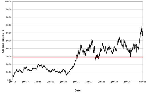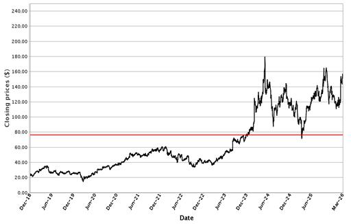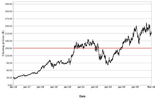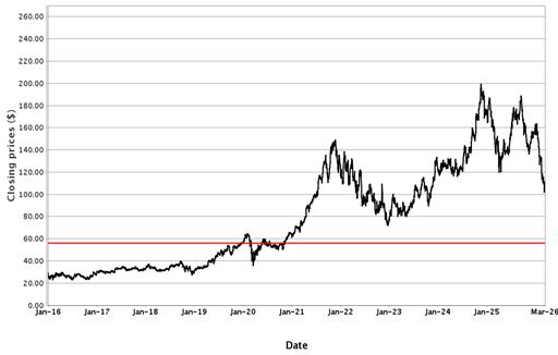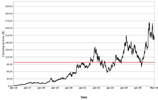 The following graphs set forth historical closing values of the Underlier for each offering for the period from January 1, 2016 (or from the initial listing date, if later) to March 17, 2026. Each red line represents a hypothetical Coupon Threshold and Barrier Value based on the closing value of the Underlier on March 17, 2026. We obtained the information in the graphs from Bloomberg Financial Markets, without independent investigation. We cannot give you assurance that the performance of the Underlier will result in the return of all of your initial investment.