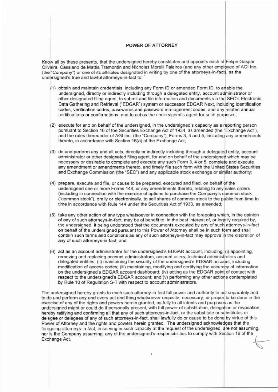 POWER OF ATTORNEY KnON all by these presents, that the undersigned hereby constitutes and appoints each of Felipe Gaspar Oliveira, Cassiano de Mattia Tramontin and Nicholas Morelli Faleiros (and any other empl yee of AGllnc. (the ·Company~) or one of its affiliates designated in writing by one of the attorneys·in-fact , as the undersigned's true and lawful attorneys-in-fact to: . (1) obtain and maintain credentials, including any Form 1D or amended Form 10, to eQable the undersigned, directly or indirectly including through a delegated entity, account ad'r inistrator or other designated filing agent, to submit and file information and documents via th~ SEC's Electronic Data Gathering and Retrieval ("EDGAR") system or successor EDGAR Next. incl ding identification codes, verification codes, passwords and password management codes, and any related annual certifications or confirmations, and to act as the undersigned's agent for such pur oses; (2) execute for and on behalf of the undersigned, in the undersigned's capacity as a J';porting person pursuant to Section 16 of the Securities Exchange Act of 1934, as amended (the Exchange Act"), and the rules thereunder of AGI Inc. (the ·Company"), Forms 3, 4 and 5, including any amendments thereto, in accordance with Section 16(a) of the Exchange Act; (3) do and perform any and all acts, directly or indirectly induding through a delegate~ entity, account administrator or other designated filing agent, for and on behalf of the undersigned which may be necessary or desirable to complete and execute any such Form 3, 4 or 5, comple ~ and execute any amendment or amendments thereto, and timely file such form with the Unite States Securities and Exchange Commission (the ·SEC") and any applicable stock exchange or si ilar authority; (4) prepare, execute and file, or cause to be prepared, executed and filed, on behalf of the undersigned one or more Forms 144, or any amendments thereto, relating to any sales orders (including in connection with the exercise of options to purchase the Company's common stock rcommon stock"), orally or electronically, to sell shares of common stock to the p blic from time to time in accordance with Rule 144 under the Securities Act of 1933, as amended; I (5) take any other action of any type whatsoever in connection with the foregoing Which, in the opinion of any of such attorneys-in-fact, may be of benefit to, in the best interest of, or legally required by, the undersigned, it being understood that the documents executed by any of such attorneys-in.fact on behalf of the undersigned pursuant to this Power of Attorney shall be in such form and shall contain such terms and conditions as any of such attorneys-in-fact may approve in the discretion of any of such attorneys-in-fact; and (6) act as an account administrator for the undersigned's EDGAR account, including: (i) appointing, removing and replacing account administrators, account users, technical administrators and delegated entities; (ii) maintaining the security of the undersigned's EDGAR account, including modification of access codes; (iii) maintaining, modifying and certifying the accuracy of information on the undersigned's EDGAR account dashboard; (iv) acting as the EDGAR point of contact with respect to the undersigned's EDGAR account; and (v) performing any other actions contemplated by Rule 10 of Regulation S-T with respect to account administrators. The undersigned hereby grants to each such attorney-in-fact full power and authority to act separately and to do and perform any and every act and thing whatsoever requisite, necessary, or proper; to be done in the exe'cise of any of the rights and powers herein granted, as fUlly to all intents and purposes as the undersigned might or could do if personally present, with full power of substitution, delegation or revocation, hereby ratifying and confirming all that any of such attorneys-in-fact, or the substitute or substitutes or delegee or delegees of any of such attorneys-in-fact, shall lawfully do or cause to be done by virtue of this Power of Attorney and the rights and powers herein granted. The undersigned acknowledges that the foregoing atlorneys·in-fact, in serving in such capacity at the request of the undersigned, are not assuming, nor;s the Company assuming, any of the undersigned's responsibilities to comply with Section 16 of the Exchange Act. j ~ This Power of Attorney shall remain in full force and effect until the undersigned ceases to be affiliated with the Company and is no longer required to file Forms 3, 4 and 5 with respect to the undersigned's holdings of and transactions in securities issued by the Company, unless earlier revoked by the undersigned in a signed writing delivered to the foregoing attorneys-in-facl. This Power of Attorney supersedes all other powers of attorney previously executed by the undersigned in respect of the subject mailer described herein. IN WITNESS WHEREOF, the undersigned has caused this Power of Attorney to be executed as of March 02,2026, Name: GABRIEL FELZENSZWALB S;gnature .J.,0/7t~ da pitaldoEstadodoRiodeJaneirO ,