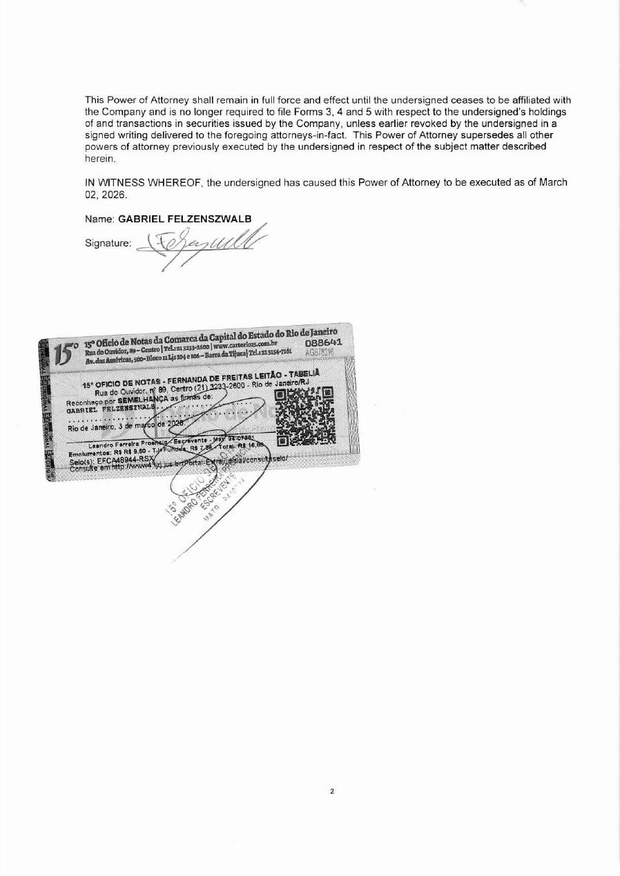 FREE TRANSLATION OF THE NOTARIZED TERMS 15th Notary Office – Fernanda de Freitas Leitão – Notary Public. 89 Ouvidor Street, Downtown, Rio de Janeiro – RJ. I hereby certify, by similarity, the signatures of: GABRIEL FELZENSZWALB. Rio de Janeiro, March 3, 2026. Leandro Ferreira Proencio – Clerk – Registration No. 94.07381. Fees: BRL 9.50 – Court + Funds BRL 7.38 – Total BRL 16.88. Seal(s): EFCA48944-RSX