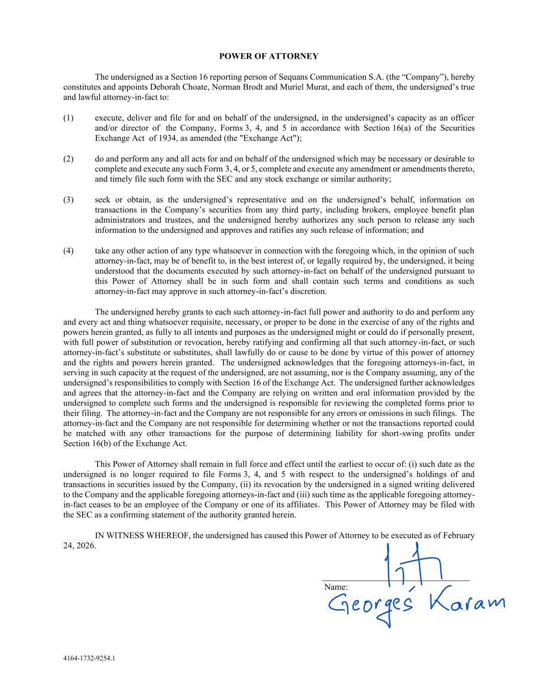 POWER OF ATTORNEY The undersigned as a Section 16 reporting person of Sequans Communication S.A. (the “Company”), hereby constitutes and appoints Deborah Choate, Norman Brodt and Muriel Murat, and each of them, the undersigned’s true and lawful attorney-in-fact to: (1) execute, deliver and file for and on behalf of the undersigned, in the undersigned’s capacity as an officer and/or director of the Company, Forms 3, 4, and 5 in accordance with Section 16(a) of the Securities Exchange Act of 1934, as amended (the "Exchange Act"); (2) do and perform any and all acts for and on behalf of the undersigned which may be necessary or desirable to complete and execute any such Form 3, 4, or 5, complete and execute any amendment or amendments thereto, and timely file such form with the SEC and any stock exchange or similar authority; (3) seek or obtain, as the undersigned’s representative and on the undersigned’s behalf, information on transactions in the Company’s securities from any third party, including brokers, employee benefit plan administrators and trustees, and the undersigned hereby authorizes any such person to release any such information to the undersigned and approves and ratifies any such release of information; and (4) take any other action of any type whatsoever in connection with the foregoing which, in the opinion of such attorney-in-fact, may be of benefit to, in the best interest of, or legally required by, the undersigned, it being understood that the documents executed by such attorney-in-fact on behalf of the undersigned pursuant to this Power of Attorney shall be in such form and shall contain such terms and conditions as such attorney-in-fact may approve in such attorney-in-fact’s discretion. The undersigned hereby grants to each such attorney-in-fact full power and authority to do and perform any and every act and thing whatsoever requisite, necessary, or proper to be done in the exercise of any of the rights and powers herein granted, as fully to all intents and purposes as the undersigned might or could do if personally present, with full power of substitution or revocation, hereby ratifying and confirming all that such attorney-in-fact, or such attorney-in-fact’s substitute or substitutes, shall lawfully do or cause to be done by virtue of this power of attorney and the rights and powers herein granted. The undersigned acknowledges that the foregoing attorneys-in-fact, in serving in such capacity at the request of the undersigned, are not assuming, nor is the Company assuming, any of the undersigned’s responsibilities to comply with Section 16 of the Exchange Act. The undersigned further acknowledges and agrees that the attorney-in-fact and the Company are relying on written and oral information provided by the undersigned to complete such forms and the undersigned is responsible for reviewing the completed forms prior to their filing. The attorney-in-fact and the Company are not responsible for any errors or omissions in such filings. The attorney-in-fact and the Company are not responsible for determining whether or not the transactions reported could be matched with any other transactions for the purpose of determining liability for short-swing profits under Section 16(b) of the Exchange Act. This Power of Attorney shall remain in full force and effect until the earliest to occur of: (i) such date as the undersigned is no longer required to file Forms 3, 4, and 5 with respect to the undersigned’s holdings of and transactions in securities issued by the Company, (ii) its revocation by the undersigned in a signed writing delivered to the Company and the applicable foregoing attorneys-in-fact and (iii) such time as the applicable foregoing attorney- in-fact ceases to be an employee of the Company or one of its affiliates. This Power of Attorney may be filed with the SEC as a confirming statement of the authority granted herein. IN WITNESS WHEREOF, the undersigned has caused this Power of Attorney to be executed as of February 24, 2026. Name: 4164-1732-9254.1