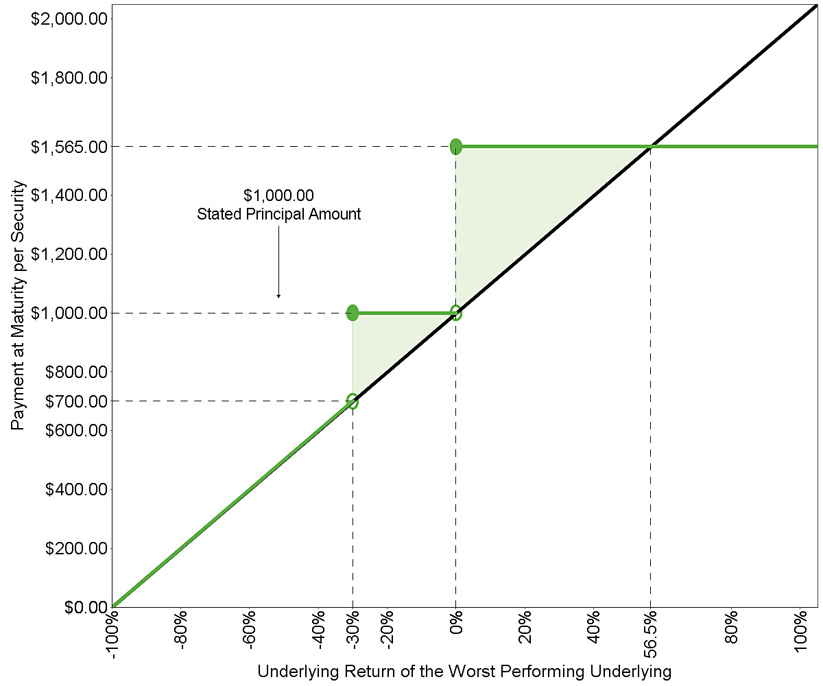 Example 3—Downside Scenario. The final underlying value of the worst performing underlying on the final valuation date is 30.00, resulting in a -70.00% underlying return for the worst performing underlying on the final valuation date. In this example, the final underlying value of the worst performing underlying on the final valuation date is less than its final barrier value.