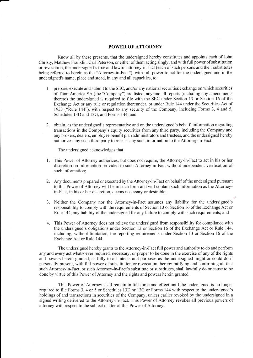 POWER OF ATTORNEY Know all by these presents, that the undersigned hereby constitutes and appoints each of John Christy, Matthew Franklin, Carl Peterson, or either ofthem acting singly, and with full power of substitution or revocation, the undersigned's true and lawful attorney-in-fact (each of such persons and their substitutes being ref'erred to herein as the "Attorney-in-Fact"), with full power to act for the undersigned and in the undersigned's name, place and stead, in any and all capacities, to: l. prepare, execute and submit to the SEC, and/or any national securities exchange on which securities of Titan America SA (the "Company") are listed, any and all reports (including any amendments thereto) the undersigned is required to file with the SEC under Section l3 or Section 16 of the Exchange Act or any rule or regulation thereunder, or under Rule 144 under the Securities Act of 1933 ("Rule I44"), with respect to any security of the Company, including Forms 3,4 and 5, Schedules l3D and l3G, and Forms 144; and 2. obtain, as the undersigned's representative and on the undersigned's behalf, information regarding transactions in the Company's equity securities from any third party, including the Company and any brokers, dealers, employee benefit plan administrators and trustees, and the undersigned hereby authorizes any such third party to release any such infomation to the Attorney-in-Fact. The undersigned acknowledges that: 1. This Power of Attomey authorizes, but does not require, the Attomey-in-Fact to act in his or her discretion on intbrmation provided to such Attorney-in-Fact without independent verification of such information; 2. Any documents prepared or executed by the Attomey-in-Fact on behalf of the undersigned pursuant to this Power of Attorney will be in such fonn and will contain such information as the Attomey- in-Fact, in his or her discretion, deems necessary or desirable; 3. Neither the Company nor the Attorney-in-Fact assumes any liability for the undersigned's responsibility to comply with the requirements of Section 13 or Section 1 6 of the Exchange Act or Rr-rle I 44, any liability of the r"rndersigned for any failure to cornply with such requirements; and 4. This Power of Attorney does not relieve the undersigned from responsibility for compliance with the undersigned's obligations under Section 13 or Section 16 of the Exchange Act or Rule 144, including, without limitation, the reporting requirements under Section 13 or Section 16 of the Exchange Act or Rule 144. The undersigned hereby gmnts to the Attorney-in-Fact fuI1 power and authority to do and perform any and every act whatsoever required, necessary. or proper to be done in the exercise ofany ofthe rights and powers herein granted, as fully to all intents and purposes as the undersigned might or could do if personally present, with full power of sr"rbstitution or revocation, hereby ratifying and confirming all that such Attorney-in-Fact, or such Attorney-in-Fact's substitute or substitutes, shall lawfully do or cause to be done by virtue of this Power of Attorney and the rights and powers herein granted. This Power of Attomey shall remain in full force and effoct untilthe undersigned is no longer required to file Forms 3,4 or 5 or Schedules l3D or l3G or Forms 144 with respect to the undersigned's holdings of and transactions in securities of the Company, unless earlier revoked by the undersigned in a signed writing delivered to the Attorney-in-Fact. This Power of Attomey revokes all previous powers of attorney with respect to the subject matter of this Power of Attomey. *t