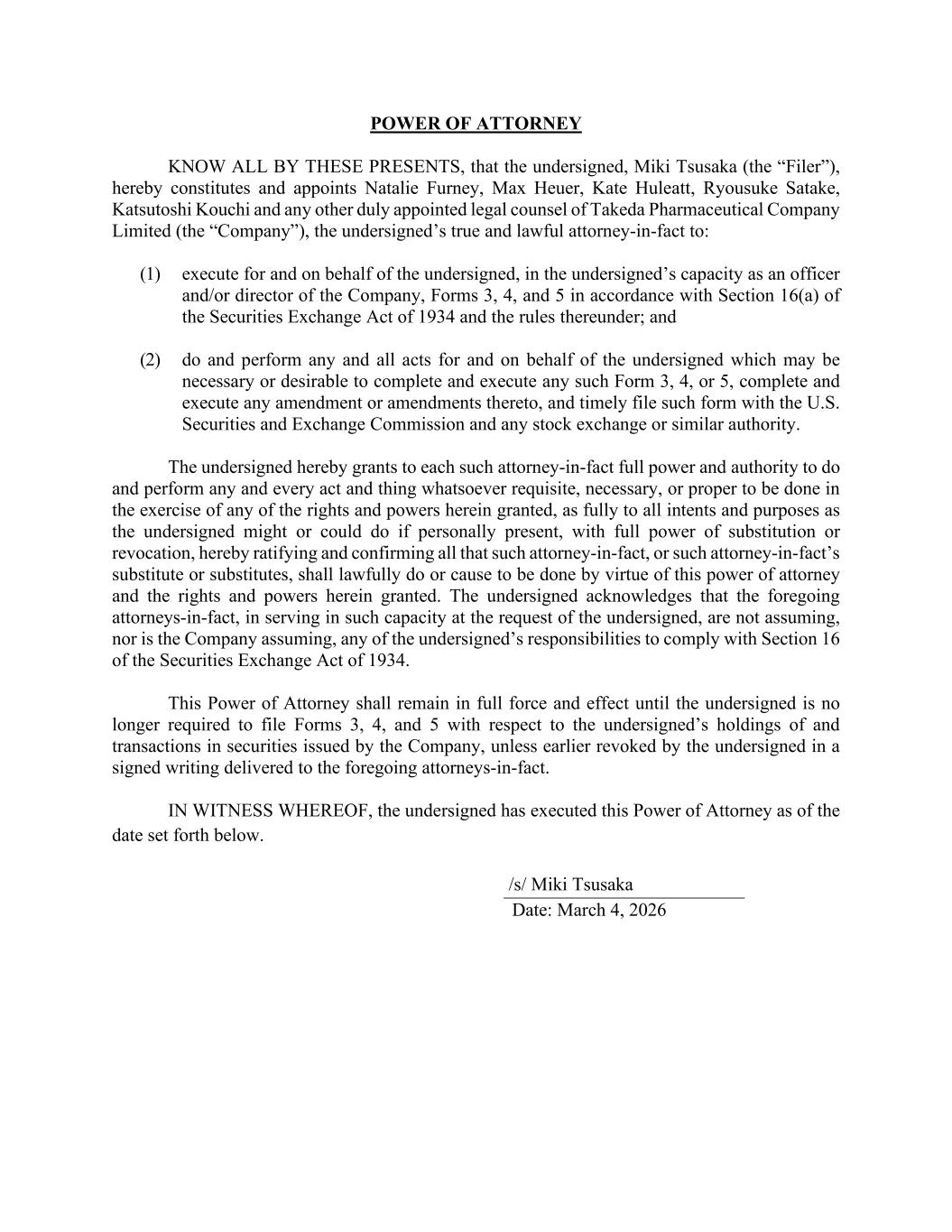 POWER OF ATTORNEY KNOW ALL BY THESE PRESENTS, that the undersigned, Miki Tsusaka (the “Filer”), hereby constitutes and appoints Natalie Furney, Max Heuer, Kate Huleatt, Ryousuke Satake, Katsutoshi Kouchi and any other duly appointed legal counsel of Takeda Pharmaceutical Company Limited (the “Company”), the undersigned’s true and lawful attorney-in-fact to: (1) execute for and on behalf of the undersigned, in the undersigned’s capacity as an officer and/or director of the Company, Forms 3, 4, and 5 in accordance with Section 16(a) of the Securities Exchange Act of 1934 and the rules thereunder; and (2) do and perform any and all acts for and on behalf of the undersigned which may be necessary or desirable to complete and execute any such Form 3, 4, or 5, complete and execute any amendment or amendments thereto, and timely file such form with the U.S. Securities and Exchange Commission and any stock exchange or similar authority. The undersigned hereby grants to each such attorney-in-fact full power and authority to do and perform any and every act and thing whatsoever requisite, necessary, or proper to be done in the exercise of any of the rights and powers herein granted, as fully to all intents and purposes as the undersigned might or could do if personally present, with full power of substitution or revocation, hereby ratifying and confirming all that such attorney-in-fact, or such attorney-in-fact’s substitute or substitutes, shall lawfully do or cause to be done by virtue of this power of attorney and the rights and powers herein granted. The undersigned acknowledges that the foregoing attorneys-in-fact, in serving in such capacity at the request of the undersigned, are not assuming, nor is the Company assuming, any of the undersigned’s responsibilities to comply with Section 16 of the Securities Exchange Act of 1934. This Power of Attorney shall remain in full force and effect until the undersigned is no longer required to file Forms 3, 4, and 5 with respect to the undersigned’s holdings of and transactions in securities issued by the Company, unless earlier revoked by the undersigned in a signed writing delivered to the foregoing attorneys-in-fact. IN WITNESS WHEREOF, the undersigned has executed this Power of Attorney as of the date set forth below. /s/ Miki Tsusaka Date: March 4, 2026