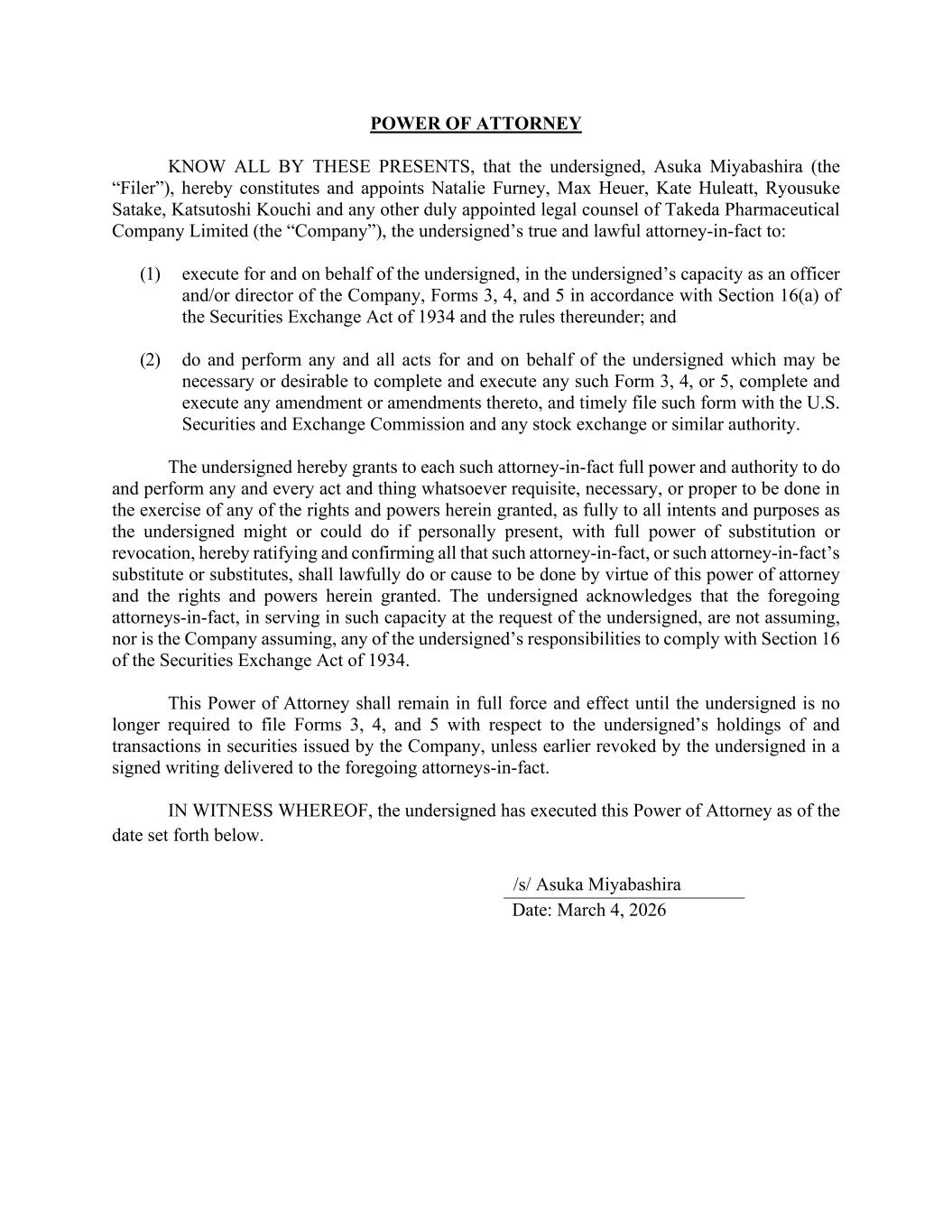 POWER OF ATTORNEY KNOW ALL BY THESE PRESENTS, that the undersigned, Asuka Miyabashira (the “Filer”), hereby constitutes and appoints Natalie Furney, Max Heuer, Kate Huleatt, Ryousuke Satake, Katsutoshi Kouchi and any other duly appointed legal counsel of Takeda Pharmaceutical Company Limited (the “Company”), the undersigned’s true and lawful attorney-in-fact to: (1) execute for and on behalf of the undersigned, in the undersigned’s capacity as an officer and/or director of the Company, Forms 3, 4, and 5 in accordance with Section 16(a) of the Securities Exchange Act of 1934 and the rules thereunder; and (2) do and perform any and all acts for and on behalf of the undersigned which may be necessary or desirable to complete and execute any such Form 3, 4, or 5, complete and execute any amendment or amendments thereto, and timely file such form with the U.S. Securities and Exchange Commission and any stock exchange or similar authority. The undersigned hereby grants to each such attorney-in-fact full power and authority to do and perform any and every act and thing whatsoever requisite, necessary, or proper to be done in the exercise of any of the rights and powers herein granted, as fully to all intents and purposes as the undersigned might or could do if personally present, with full power of substitution or revocation, hereby ratifying and confirming all that such attorney-in-fact, or such attorney-in-fact’s substitute or substitutes, shall lawfully do or cause to be done by virtue of this power of attorney and the rights and powers herein granted. The undersigned acknowledges that the foregoing attorneys-in-fact, in serving in such capacity at the request of the undersigned, are not assuming, nor is the Company assuming, any of the undersigned’s responsibilities to comply with Section 16 of the Securities Exchange Act of 1934. This Power of Attorney shall remain in full force and effect until the undersigned is no longer required to file Forms 3, 4, and 5 with respect to the undersigned’s holdings of and transactions in securities issued by the Company, unless earlier revoked by the undersigned in a signed writing delivered to the foregoing attorneys-in-fact. IN WITNESS WHEREOF, the undersigned has executed this Power of Attorney as of the date set forth below. /s/ Asuka Miyabashira Date: March 4, 2026