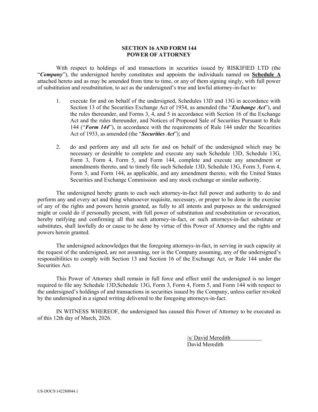 US-DOCS\142280044.1 SECTION 16 AND FORM 144 POWER OF ATTORNEY With respect to holdings of and transactions in securities issued by RISKIFIED LTD (the “Company”), the undersigned hereby constitutes and appoints the individuals named on Schedule A attached hereto and as may be amended from time to time, or any of them signing singly, with full power of substitution and resubstitution, to act as the undersigned’s true and lawful attorney-in-fact to: 1. execute for and on behalf of the undersigned, Schedules 13D and 13G in accordance with Section 13 of the Securities Exchange Act of 1934, as amended (the “Exchange Act”), and the rules thereunder, and Forms 3, 4, and 5 in accordance with Section 16 of the Exchange Act and the rules thereunder, and Notices of Proposed Sale of Securities Pursuant to Rule 144 (“Form 144”), in accordance with the requirements of Rule 144 under the Securities Act of 1933, as amended (the “Securities Act”); and 2. do and perform any and all acts for and on behalf of the undersigned which may be necessary or desirable to complete and execute any such Schedule 13D, Schedule 13G, Form 3, Form 4, Form 5, and Form 144, complete and execute any amendment or amendments thereto, and to timely file such Schedule 13D, Schedule 13G, Form 3, Form 4, Form 5, and Form 144, as applicable, and any amendment thereto, with the United States Securities and Exchange Commission and any stock exchange or similar authority. The undersigned hereby grants to each such attorney-in-fact full power and authority to do and perform any and every act and thing whatsoever requisite, necessary, or proper to be done in the exercise of any of the rights and powers herein granted, as fully to all intents and purposes as the undersigned might or could do if personally present, with full power of substitution and resubstitution or revocation, hereby ratifying and confirming all that such attorney-in-fact, or such attorneys-in-fact substitute or substitutes, shall lawfully do or cause to be done by virtue of this Power of Attorney and the rights and powers herein granted. The undersigned acknowledges that the foregoing attorneys-in-fact, in serving in such capacity at the request of the undersigned, are not assuming, nor is the Company assuming, any of the undersigned’s responsibilities to comply with Section 13 and Section 16 of the Exchange Act, or Rule 144 under the Securities Act. This Power of Attorney shall remain in full force and effect until the undersigned is no longer required to file any Schedule 13D,Schedule 13G, Form 3, Form 4, Form 5, and Form 144 with respect to the undersigned’s holdings of and transactions in securities issued by the Company, unless earlier revoked by the undersigned in a signed writing delivered to the foregoing attorneys-in-fact. IN WITNESS WHEREOF, the undersigned has caused this Power of Attorney to be executed as of this 12th day of March, 2026. /s/ David Meredith David Meredith